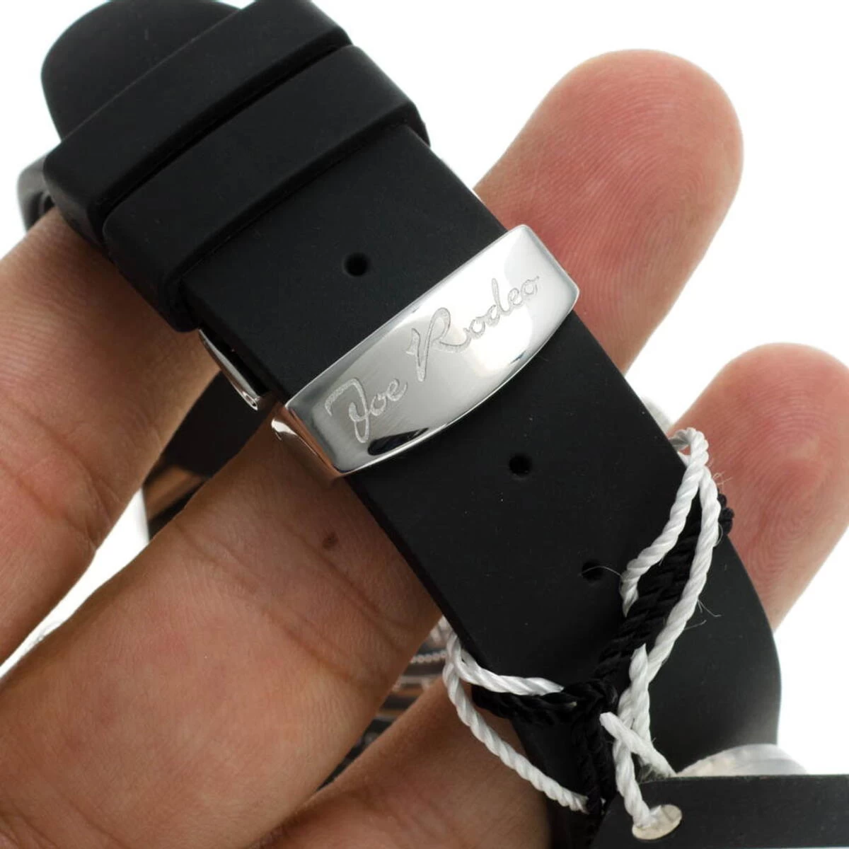 This Men’s Floating Diamond Watch (Joe Rodeo Master) features 2.20 carats of round diamonds, a polished Silver stainless steel case and case-back, scratch-free crystal glass and rubber band. This diamond watch features two rows of diamonds around the bezel and on the lugs and white floating stones inside the dial. Super accurate Swiss-made quartz movement with chronograph function. This iced out watches collection piece by Joe Rodeo comes with two extra interchangeable bands in different colors. Water-resistant 50m (165 ft).