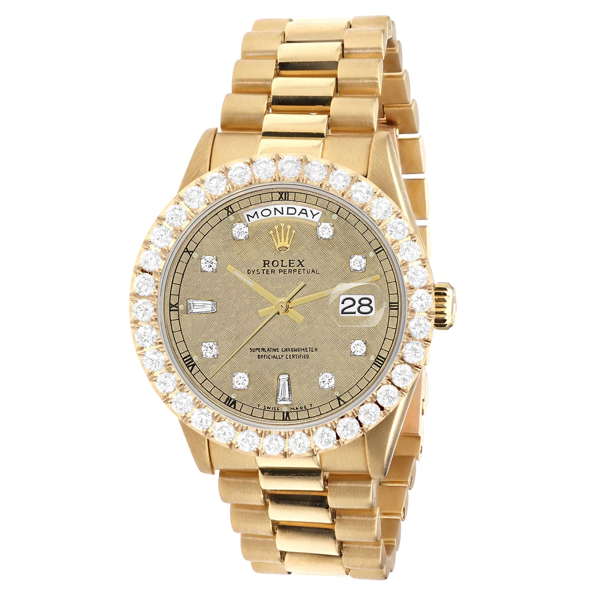 Men’s Gold Watch Rolex Day-Date 36mm Gold Tone Printed Dial President Bracelet Diamond 4ct Bezel. This diamond Rolex watch is pre-owned, in excellent condition, and comes in a Rolex box with a full warranty from ItsHot. Customize the look of the watch if you prefer with diamond bezel or fluted bezel. Each watch can be additionally customized with diamonds on the case as well as band (please contact us for details).