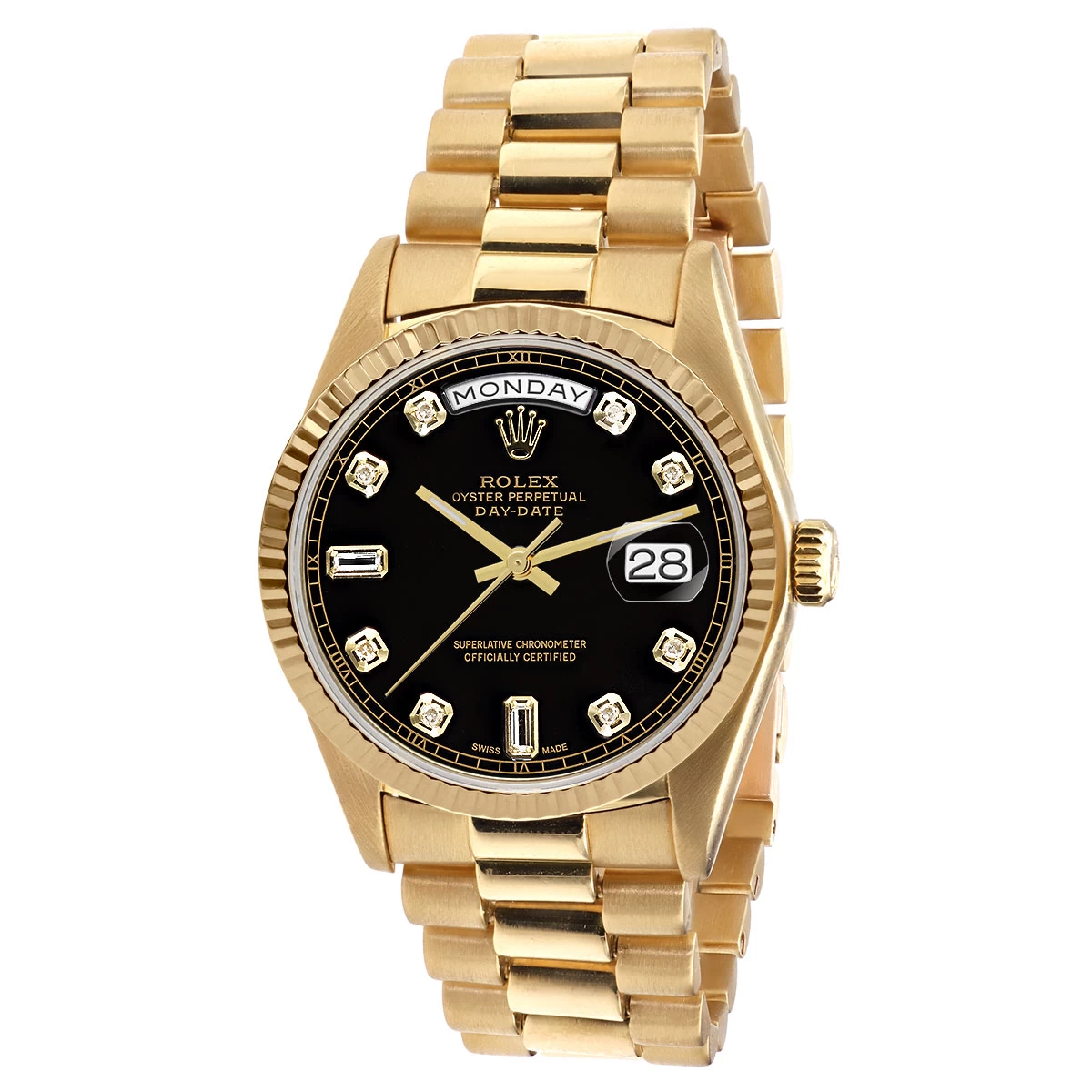 Men’s Gold Watch Rolex Day-Date Diamond 36mm Black Onyx Dial President Bracelet. This diamond Rolex watch is pre-owned, in excellent condition, and comes in a Rolex box with a full warranty from ItsHot. Customize the look of the watch if you prefer with diamond bezel or fluted bezel. Each watch can be additionally customized with diamonds on the case as well as band (please contact us for details).