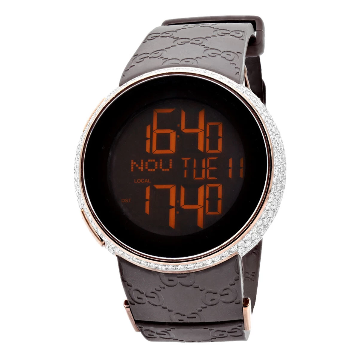 This Swiss-made Men’s Diamond Watch by Gucci features 3.10 carats of genuine diamonds around the brown stainless steel case, a scratch resistant sapphire crystal and a rubber band and a digital dial code with GMT second time zone feature. This diamond I-Gucci watch showcases a fine battery operated quartz movement and is water-resistant to 30 meters (100 feet water-resistant).