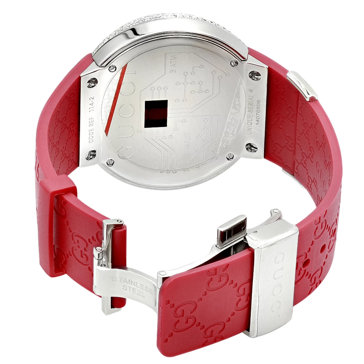 Swiss-made Men’s GUCCI Luxury Diamond Watch (YA114212) features 3.10 carats of white sparkling diamonds around the silver tone polished stainless steel 44 mm (1 3/4″) case, a scratch-resistant sapphire crystal, a red 7″ adjustable “GG” rubber strap and a black digital dial code with GMT second time zone feature. This diamond I-Gucci watch showcases a fine battery operated quartz movement and is water-resistant to 30 meters (100 feet water-resistant).