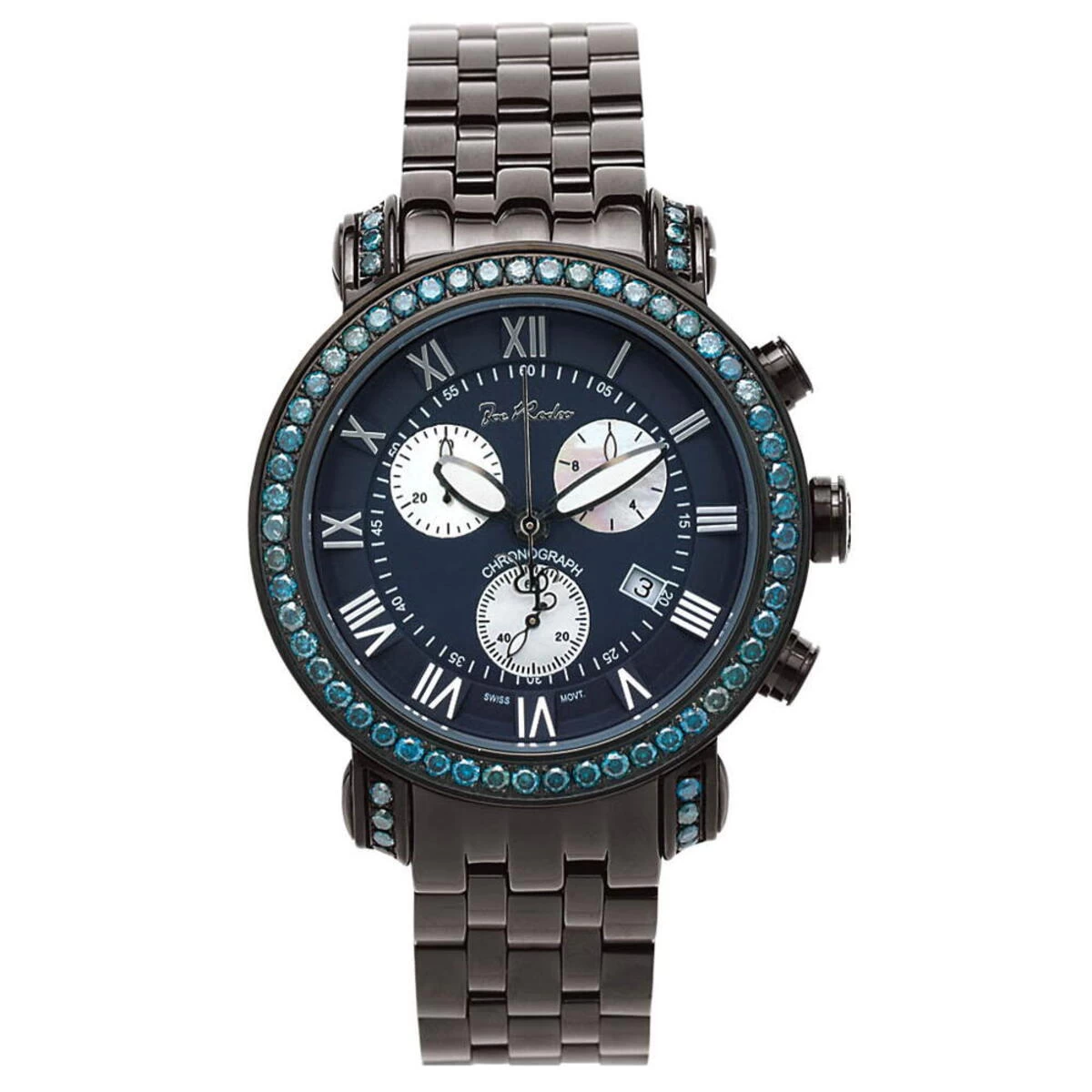This Men’s Joe Rodeo Blue Diamond Watch – JoJo Classic watch – features 5.50 carats of sparkling blue diamonds on the bezel, sides and the lugs of the black stainless steel case. This Joe Rodeo diamond watch showcases a blue dial with three white mother of pearl chronograph subdials, a date display window at the 4 o’clock position, and a black stainless steel band. This luxurious men’s diamond watch by Joe Rodeo is equipped with a super accurate Swiss-made chronograph quartz movement. The case is water-resistant to 100m (330 ft).