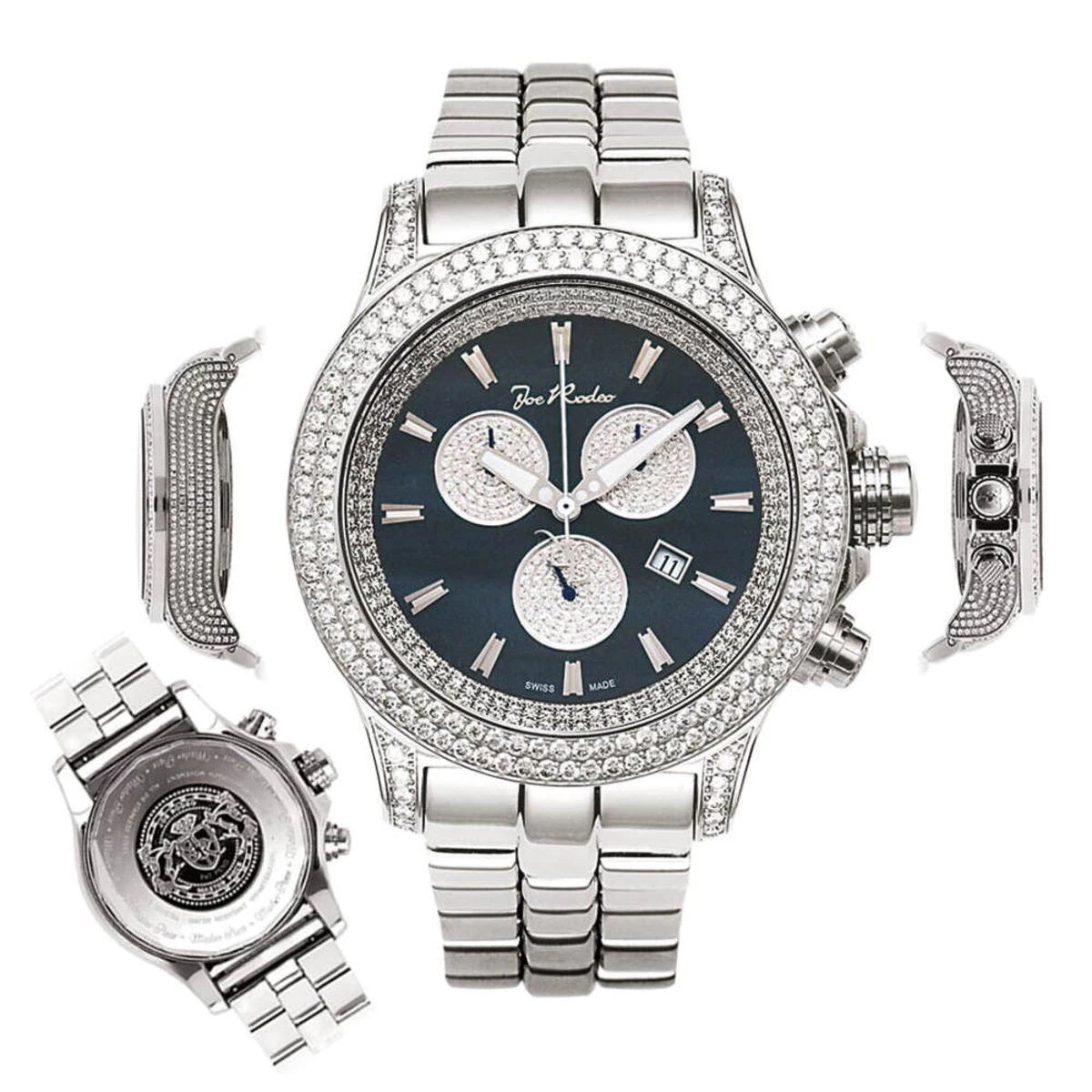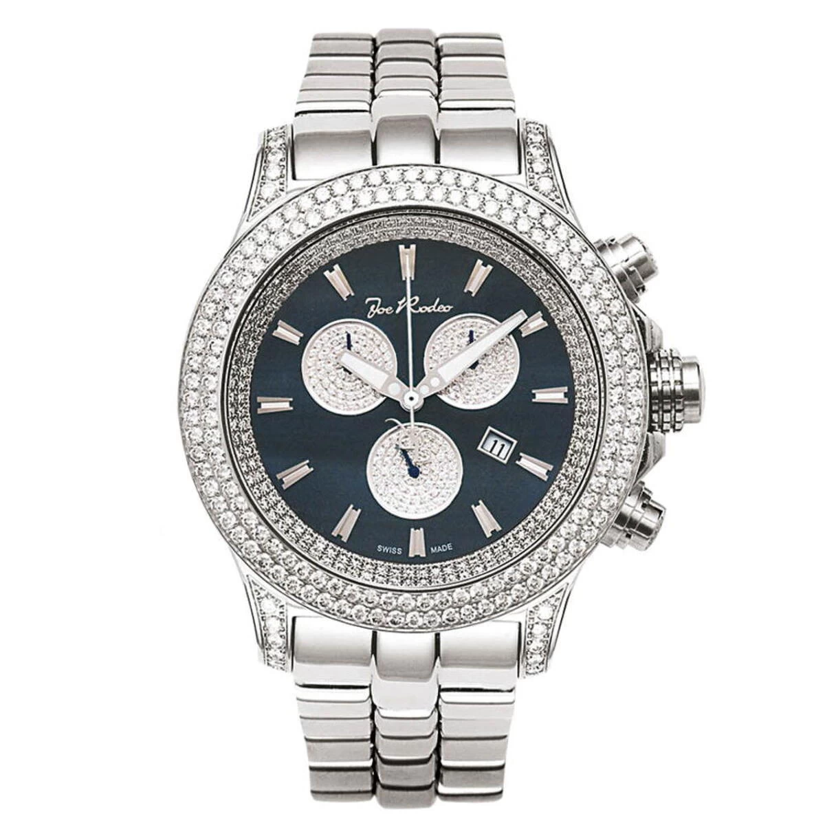 This Men’s Joe Rodeo Diamond Watch Master Pilot features 14.70 carats of sparkling white diamonds on the bezel, white diamonds on the sides and lugs of the silver tone stainless steel case. This exquisite Joe Rodeo diamond watch showcases a dark blue mother of pearl dial with three chronograph subdials paved in sparkling white diamonds, a date display window at the 4 o’clock position, and 2 rows of glistening white diamonds around it, all protected by a scratch-free crystal glass. This luxurious men’s diamond watch by Joe Rodeo is equipped with a super accurate Swiss-made chronograph quartz movement. The case is water-resistant to 100m (330 ft).