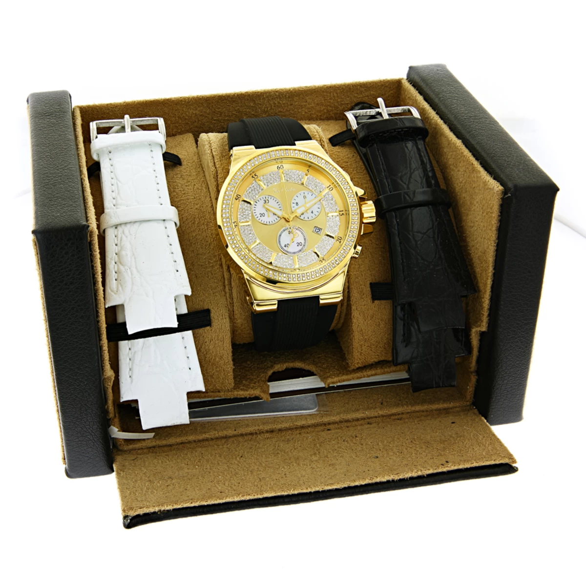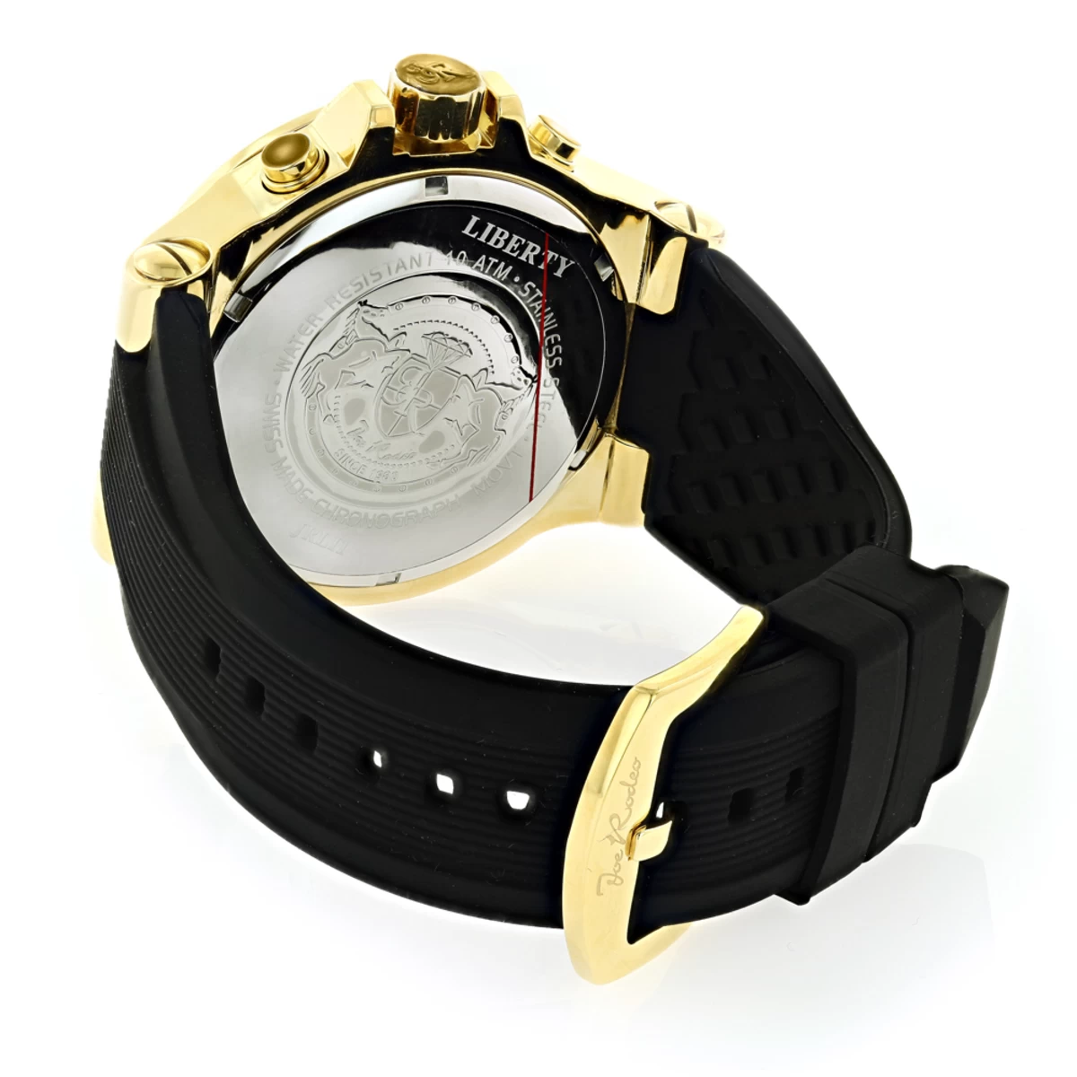 This Men’s Joe Rodeo Liberty Diamond Watch Yellow Gold Plated showcases 1.5 carats of white round diamonds on bezel. This watch features scratch-free crystal glass, individually engraved stainless steel back, fine Swiss-made quartz movement with chronograph function, center second and date. Water-resistant to 10 ATM. Comes with two interchangeable straps in different colors and soft to touch main rubber band.