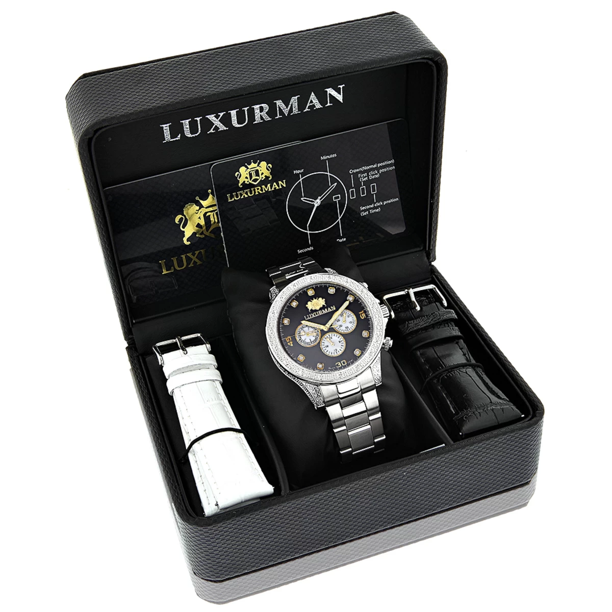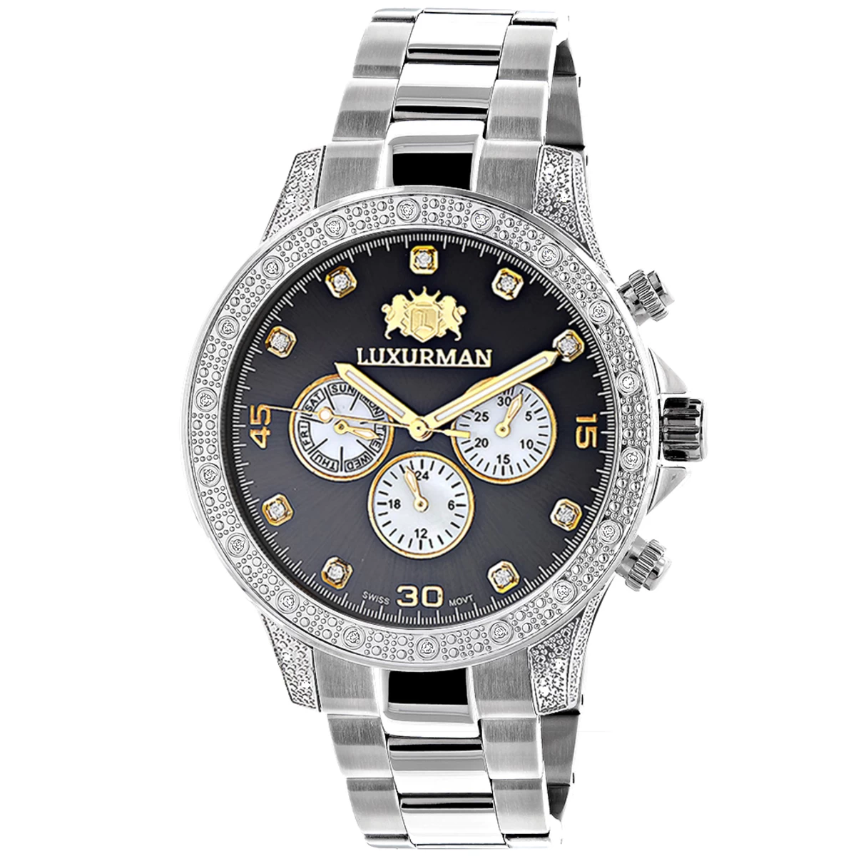 This Men’s Luxurman Diamond Watch Two Tone – Liberty model – features 0.5 carats of sparkling round diamonds and a fine Swiss movement. This men’s diamond watch showcases a black dial with Date/Calendar/24 hours white mother of pearl subdials, and a silver tone stainless steel band and case. This designer diamond watch by Luxurman comes in full retail packaging with two extra interchangeable straps in different colors and quality made, backed by 5 year factory warranty. This Luxurman Diamond watch makes a perfect present for any occasion.