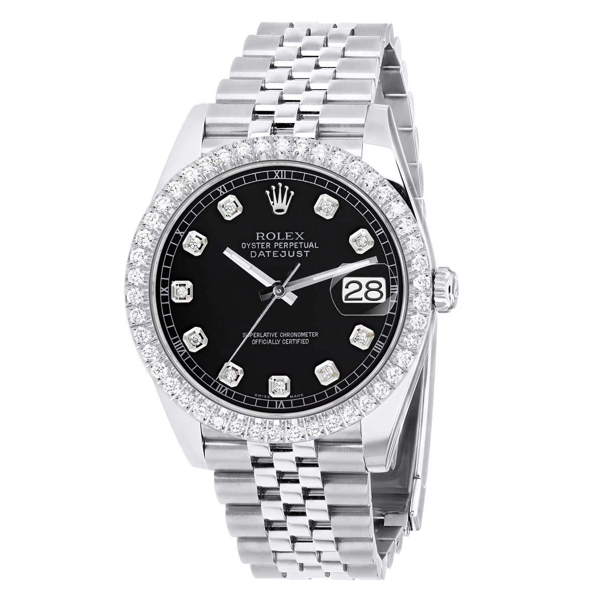 Men’s Rolex Datejust 41mm Black Dial Jubilee Bracelet Diamond Bezel. This diamond Rolex watch is pre-owned, in excellent condition, and comes in a Rolex box with a full warranty from ItsHot. Customize the look of the watch if you prefer with diamond bezel or fluted bezel. Each watch can be additionally customized with diamonds on the case as well as band (please contact us for details).