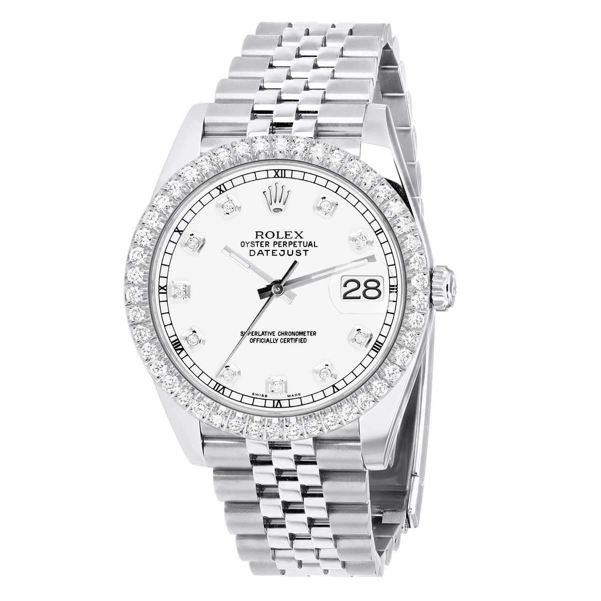 Men’s Rolex Datejust 41mm White Dial Diamond Bezel. This diamond Rolex watch is pre-owned, in excellent condition, and comes in a Rolex box with a full warranty from ItsHot. Customize the look of the watch if you prefer with diamond bezel or fluted bezel. Each watch can be additionally customized with diamonds on the case as well as band (please contact us for details).
