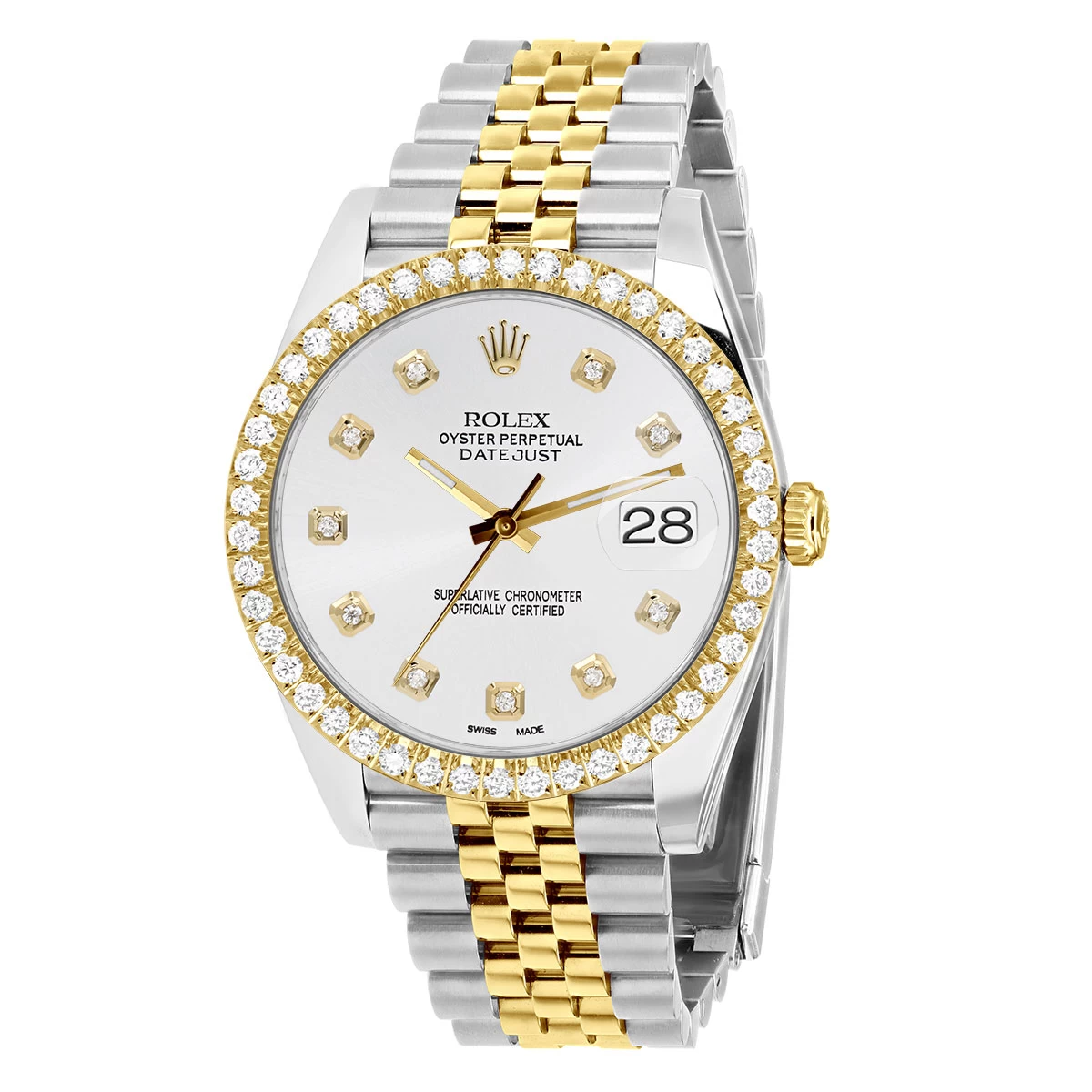 Men’s Two Tone Rolex Datejust 41mm White Dial Jubilee Bracelet Diamond Bezel. This diamond Rolex watch is pre-owned, in excellent condition, and comes in a Rolex box with a full warranty from ItsHot. Customize the look of the watch if you prefer with diamond bezel or fluted bezel. Each watch can be additionally customized with diamonds on the case as well as band (please contact us for details).