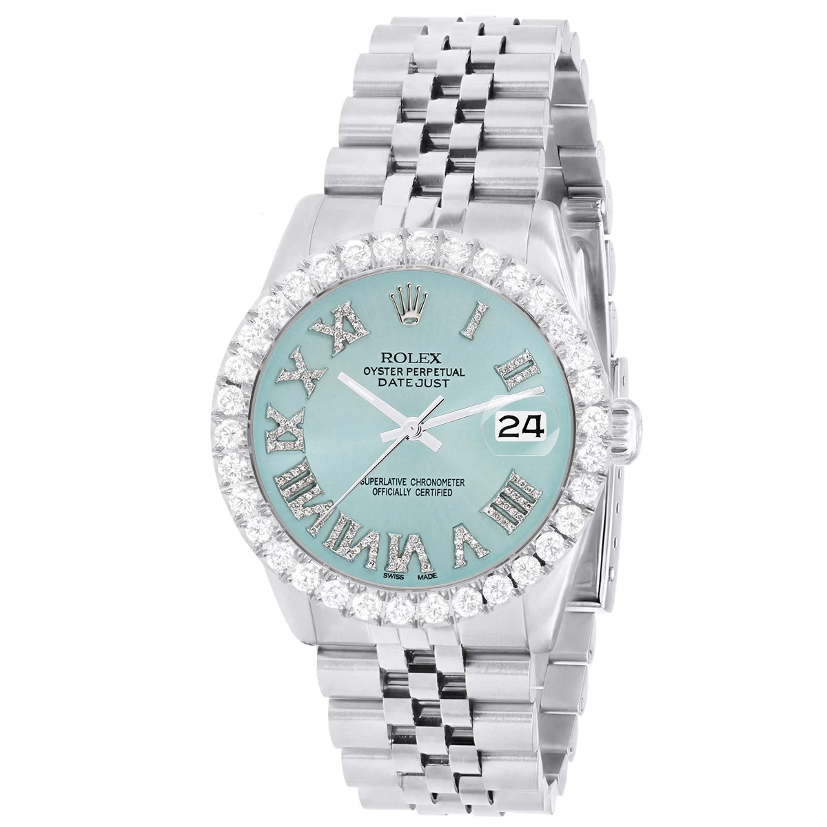 Men’s Watch Rolex Datejust 36mm Light Blue Roman Numerals Dial Jubilee Bracelet Diamond 4ct Bezel. This diamond Rolex watch is pre-owned, in excellent condition, and comes in a Rolex box with a full warranty from ItsHot. Customize the look of the watch if you prefer with diamond bezel or fluted bezel. Each watch can be additionally customized with diamonds on the case as well as band (please contact us for details).