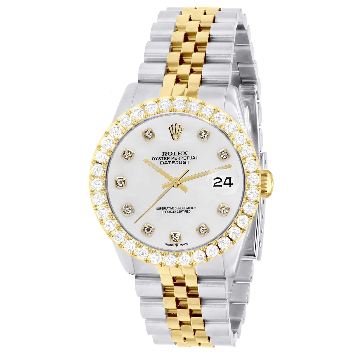 Men’s Watch Rolex Datejust 36mm White Dial Jubilee Bracelet Diamond 4ct Bezel. This diamond Rolex watch is pre-owned, in excellent condition, and comes in a Rolex box with a full warranty from ItsHot. Customize the look of the watch if you prefer with diamond bezel or fluted bezel. Each watch can be additionally customized with diamonds on the case as well as band (please contact us for details).