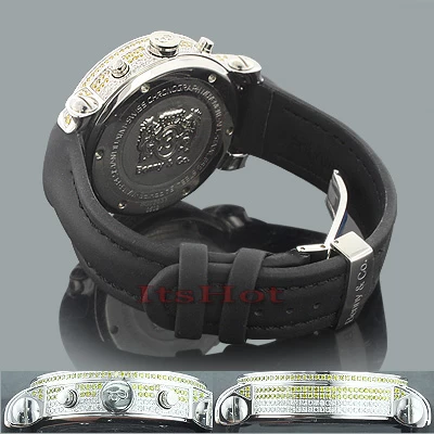 This Men’s White Yellow Diamond Watch by Benny and Co from our New Arrival category features a polished stainless steel case, a sapphire crystal glass, and an individually numbered and engraved stainless steel case-back. The polished stainless steel case is hand-set with 7.50 carats sparkling white and yellow round diamonds. The black dial with floating sparkling white and yellow diamonds showcases three white mother-of-pearl subdials, a date display window at the 4 o’clock position and Roman numerals. Fine Swiss-made quartz movement with chronograph function, center second, and date. This diamond Benny and Company watches collection piece comes with three interchangeable rubber straps and one leather strap, all with engraved butterfly clasps.