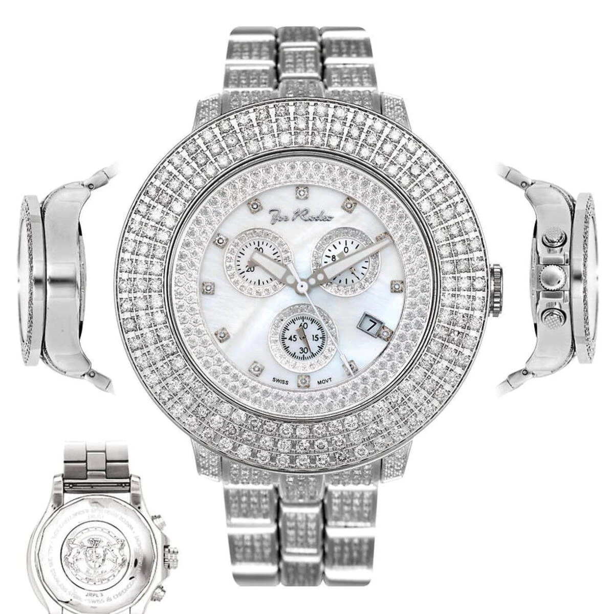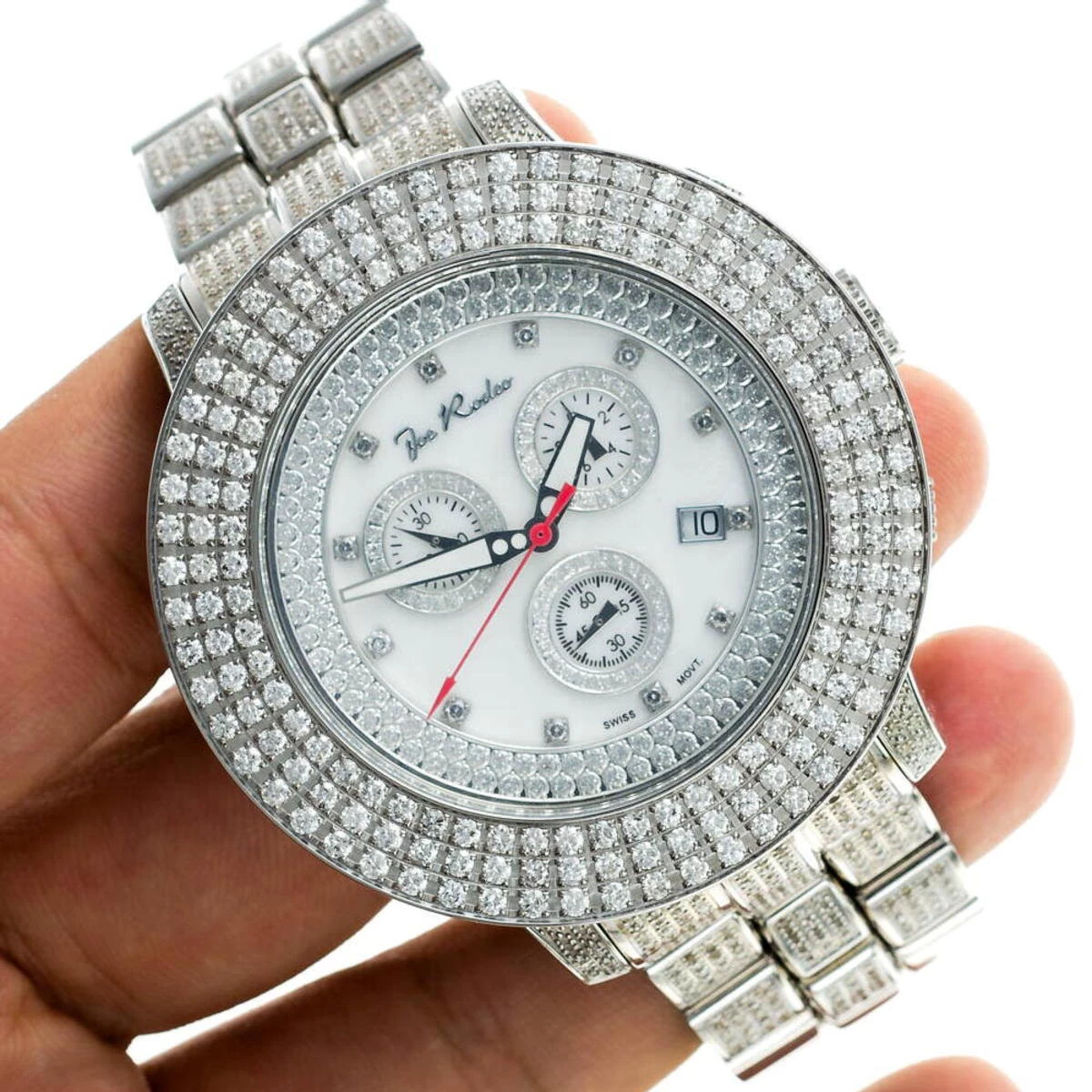 Oversized Iced Out Watches! This Joe Rodeo Pilot Men’s Diamond Watch features a huge 55mm silver gold stainless steel case with 11 carats of sparkling round diamonds set on its bezel, lugs and the band, white mother of pearl face has three chronograph subdials, a date display window at 4 oclock position and glistening white stones set as hour markers. This Joe Rodeo Pilot watch is equipped with a super accurate Swiss-made chronograph quartz movement and is water-resistant to 100m (330 ft).