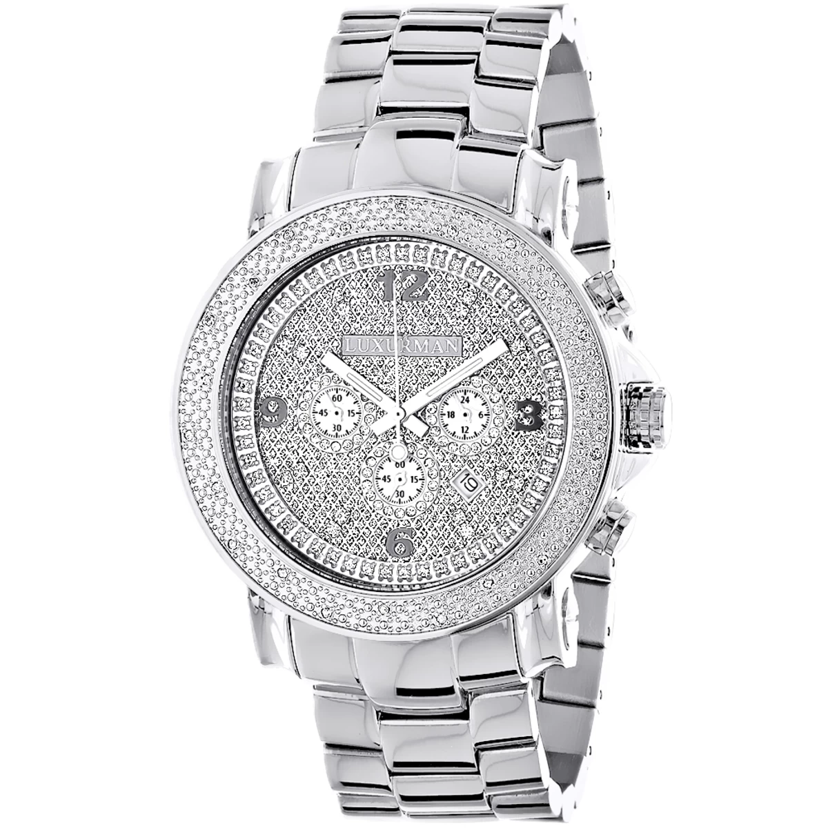 This Oversized Men’s Diamond Watch Luxurman Escalade with Chronograph showcases 0.25 carats of genuine diamonds. Features a dial paved in sparkling stones with three white mother of pearl chronograph subdials, a date display window at the 4 oclock position, and a silver tone stainless steel bracelet. This luxurious men’s diamond watch by Luxurman houses a fine Japan-made quartz movement and comes with two interchangeable straps in different colors (band colors may vary).