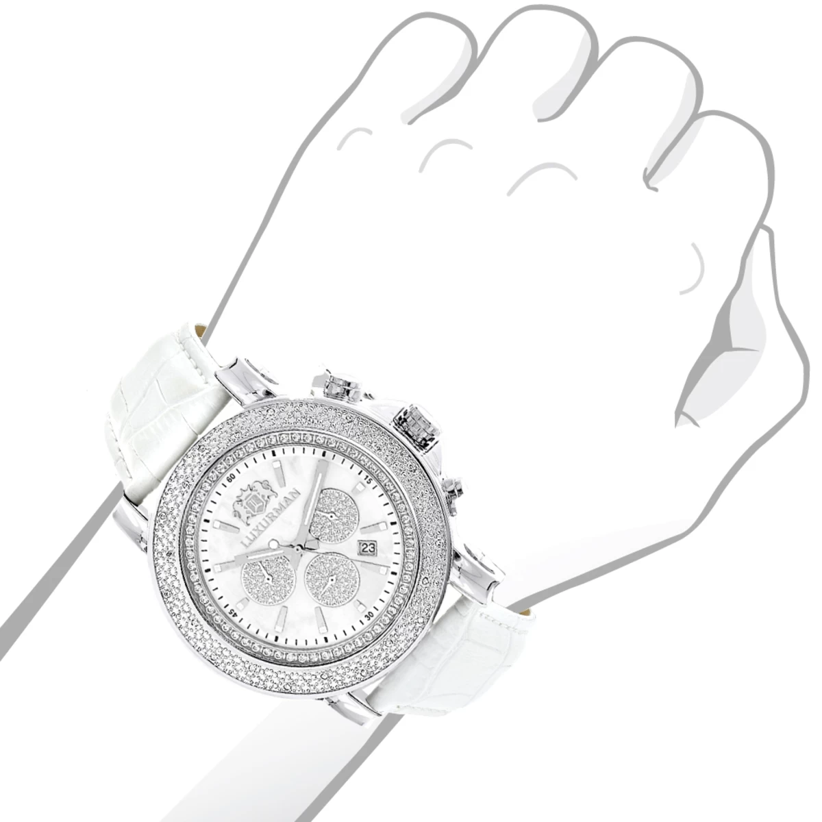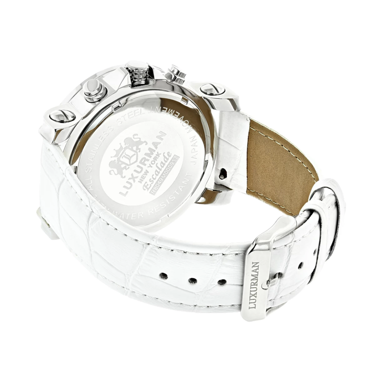 This Oversized Men’s Diamond Watch White MOP Luxurman Escalade w Chronograph showcases 0.25 carats of genuine diamonds and features a white mother of pearl dial with three chronograph subdials paved in sparkling stones, a date display window, and a white leather band. This luxurious men’s diamond watch by Luxurman showcase fine Japan-made quartz movement and comes with two extra interchangeable leather straps in different colors (black and brown). This is a brand new watch, comes in full retail packaging, with full 5 year factory warranty.