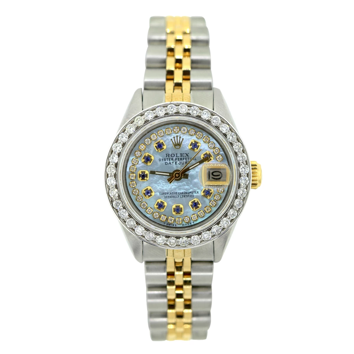 This luxurious Rolex Datejust Ladies Custom Diamond Watch features 1.5 carats of sparkling genuine diamonds, a brushed stainless steel case, and a stainless steel band. This Rolex Ladies Diamond Watch showcases a blue mother of pearl dial with blue sapphires and a date display at the 3 o’clock position. Please note: this custom Rolex diamond watch is pre-owned and comes with a 5-year warranty from ItsHot.com.