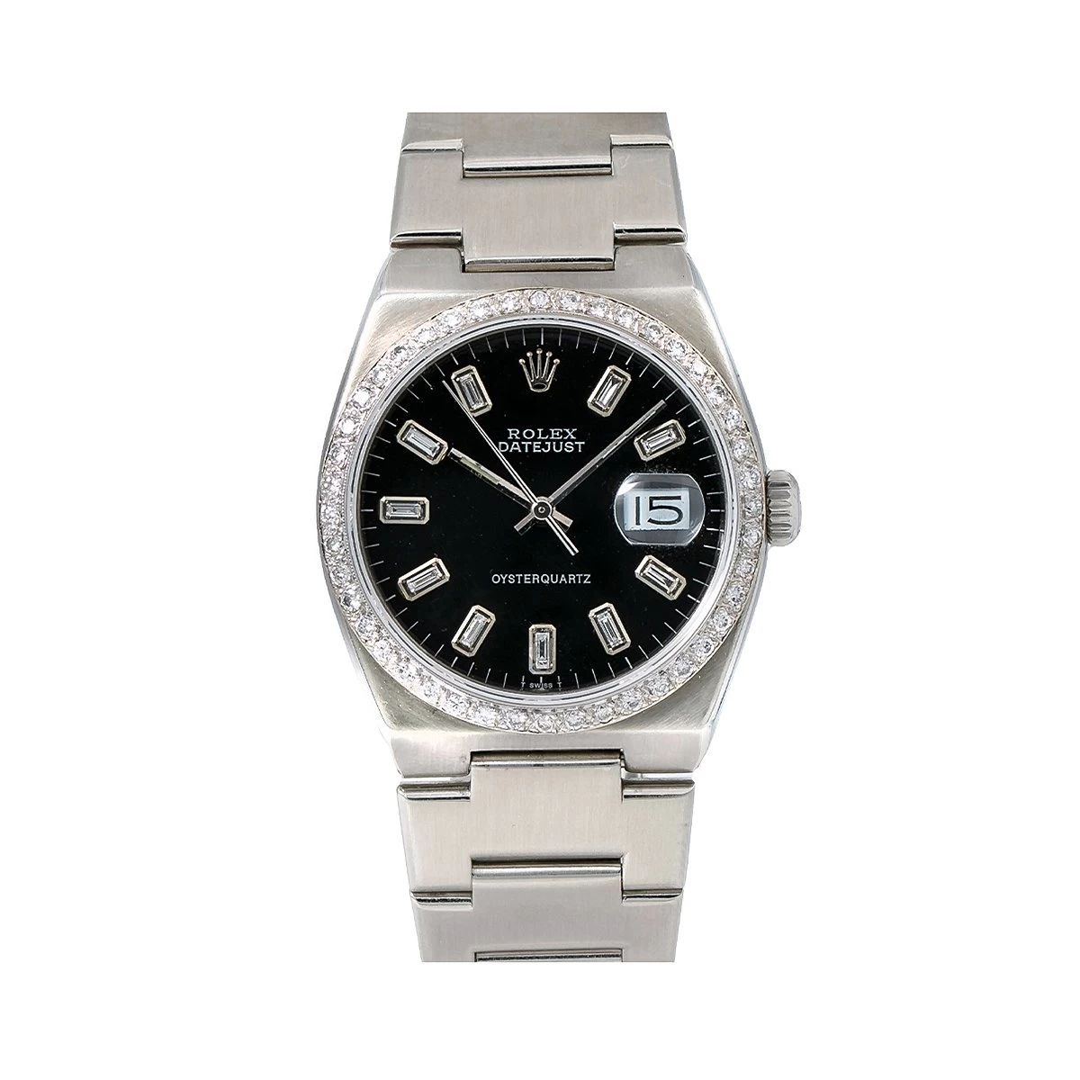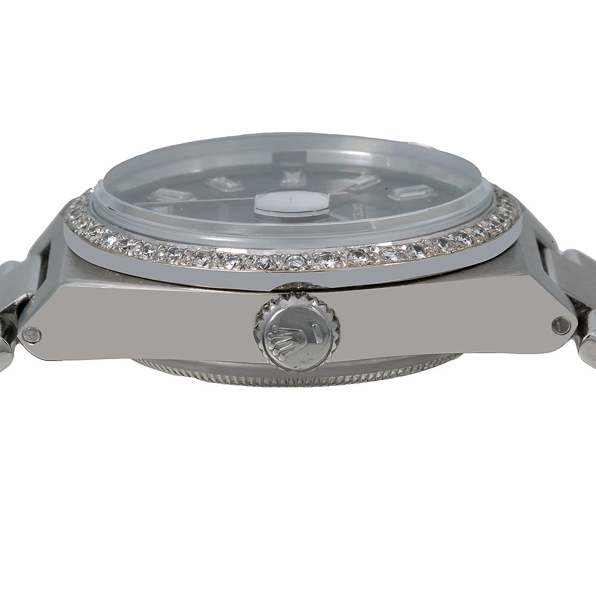 This Rolex watch is from our men’s diamond watches collection. This neat and elegant Rolex Datejust 17000 36mm Black Dial watch for men displays white round cut diamonds meticulously set into the bezel of the watch and baguette cut diamonds decorating the extraordinary black dial. The watch also has a convenient date window positioned at three o’clock and is water resistant to 100 meters. Featuring such a classy design, this men’s diamond watch will be able to elevate your every outfit, no matter how official or sporty it will be. This Rolex Datejust watch and its Oyster bracelet are made of stainless steel, so this statement-making timepiece is going to last you a lifetime. This men’s Rolex watch is pre-owned, in excellent condition, and comes in an original box with a full 5-year warranty from ItsHot.com.