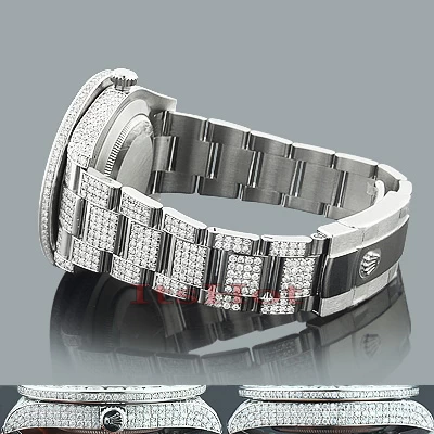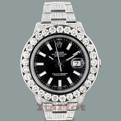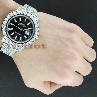 This custom Rolex Oyster Perpetual Datejust men’s diamond watch features 25.40 carats of genuine sparkling diamonds, a polished stainless steel case, and a polished silver-tone stainless steel diamond band. This Rolex men’s diamond watch showcases a black dial with luminous hour markers and a date display at the 3 o’clock position. This custom Rolex diamond watch is pre-owned in excellent condition and comes with a full 5-year warranty from ItsHot.com.