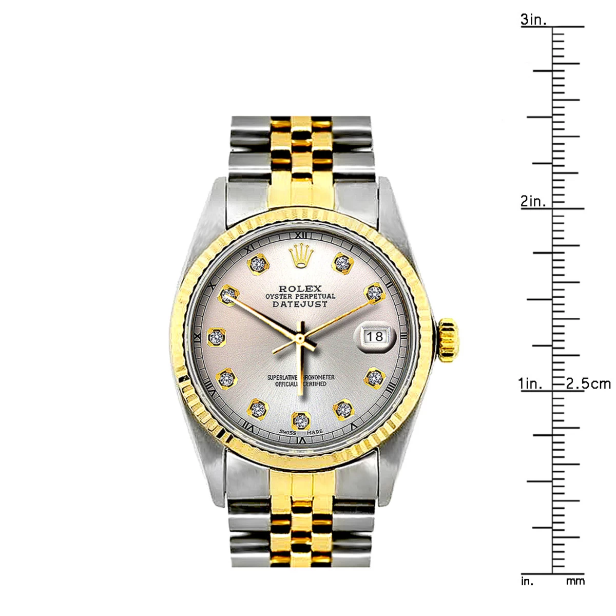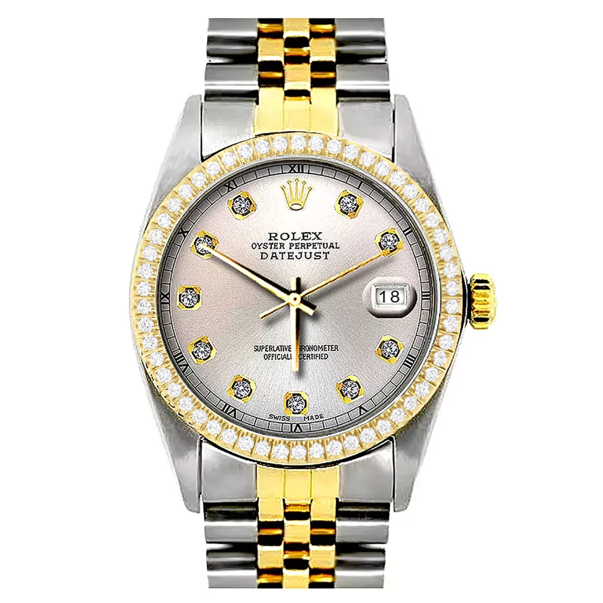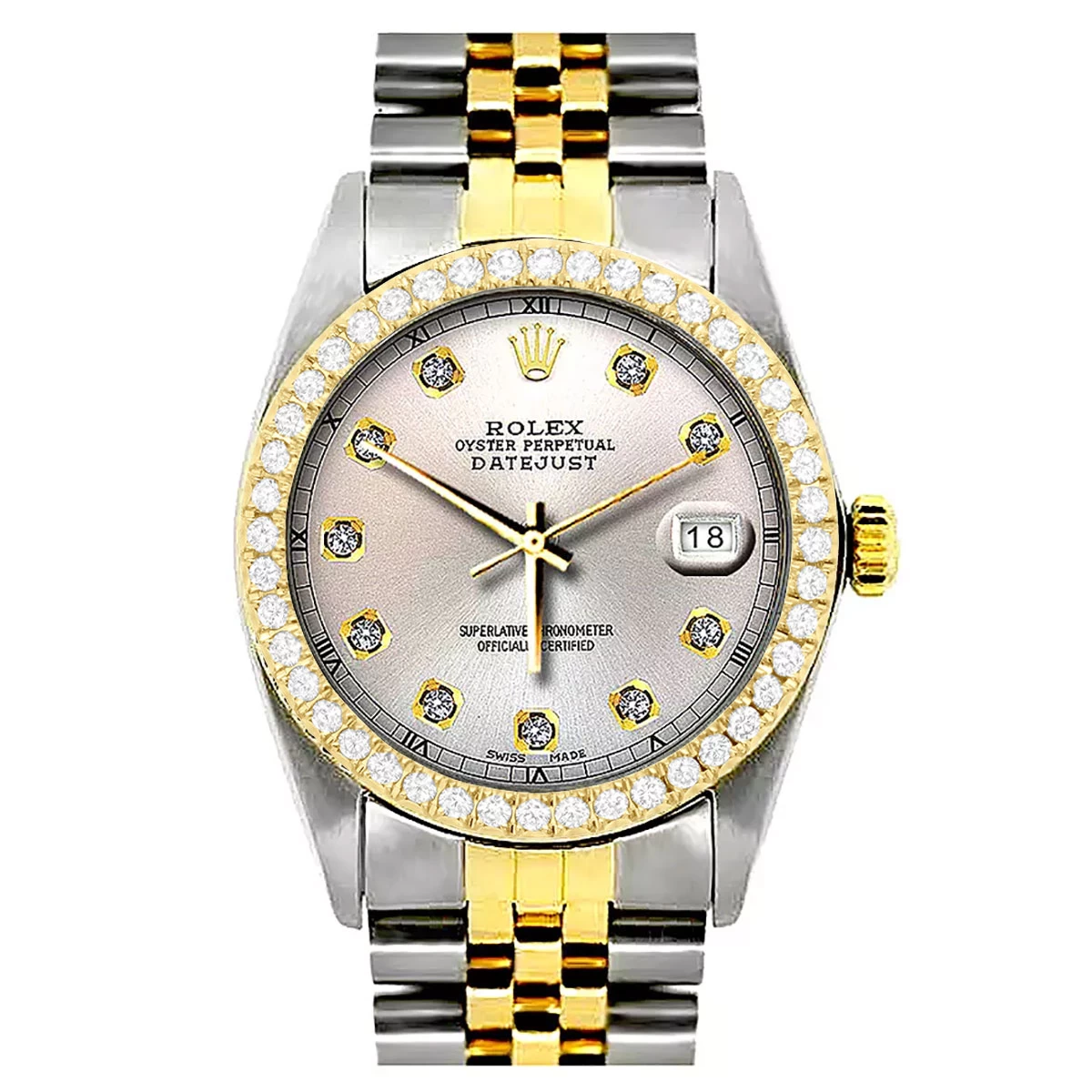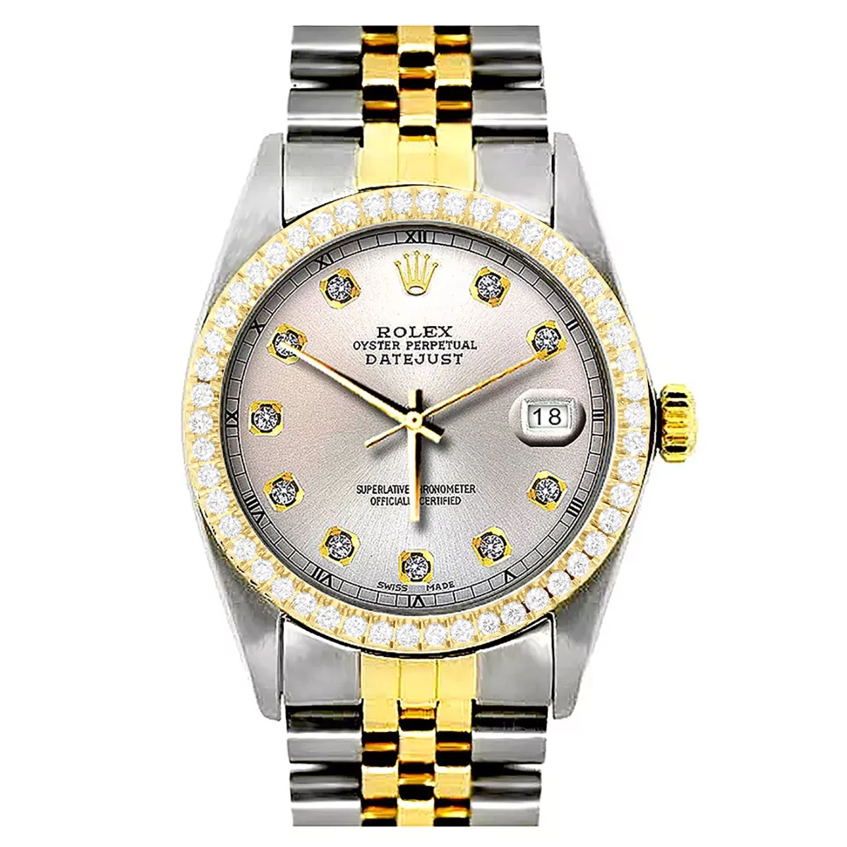 This amazing Two Tone Rolex Datejust Men’s Custom Watch Stainless Steel & Yellow Gold features 0.1 carats of sparkling round cut genuine diamonds, a brushed stainless steel case, stainless steel, and a yellow gold band and bezel. This Rolex Diamond Watch for Men showcases a classy silver color dial and a date display at the 3 o’clock position. Please note: this custom Rolex diamond watch is pre-owned, in Like New condition, and comes with a 5-year warranty from ItsHot.com.