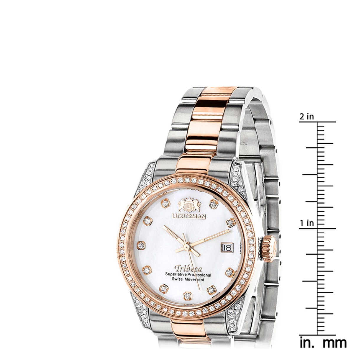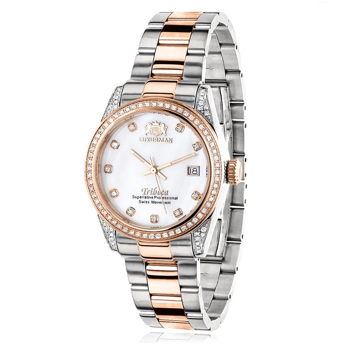 This Two Tone Rose Gold Plated Women’s Diamond Watch 1.5ct Luxurman Tribeca features a carat and a half of genuine diamonds, a Swiss Quartz movement, luxurious white Mother of Pearl dial with a date display window at a 3 o’clock position and a beautiful two tone 18k gold plated case and band. This stylish ladies diamond watch by Luxurman comes with two extra leather interchangeable straps in different colors and includes an exclusive 5 year factory warranty. This Luxurman Diamond watch is brand new, comes in retail box and is a perfect present for any occasion.