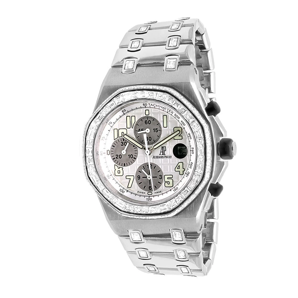 Pre-Owned Audemars Piguet Royal Oak Offshore Round and Baguette Diamond Watch for Men self – winding automatic watch, features a 42mm stainless steel case surrounding a silver Mega Tapiserrie dial on a stainless steel bracelet with folding buckle. This very unique AP watch features VS round and baguette diamonds on the bezel and VS quality baguette diamonds on the band. Functions include hours, minutes, small seconds, date, chronograph and tachymeter. This watch has been serviced, it is in excellent condition and comes with original box and papers.