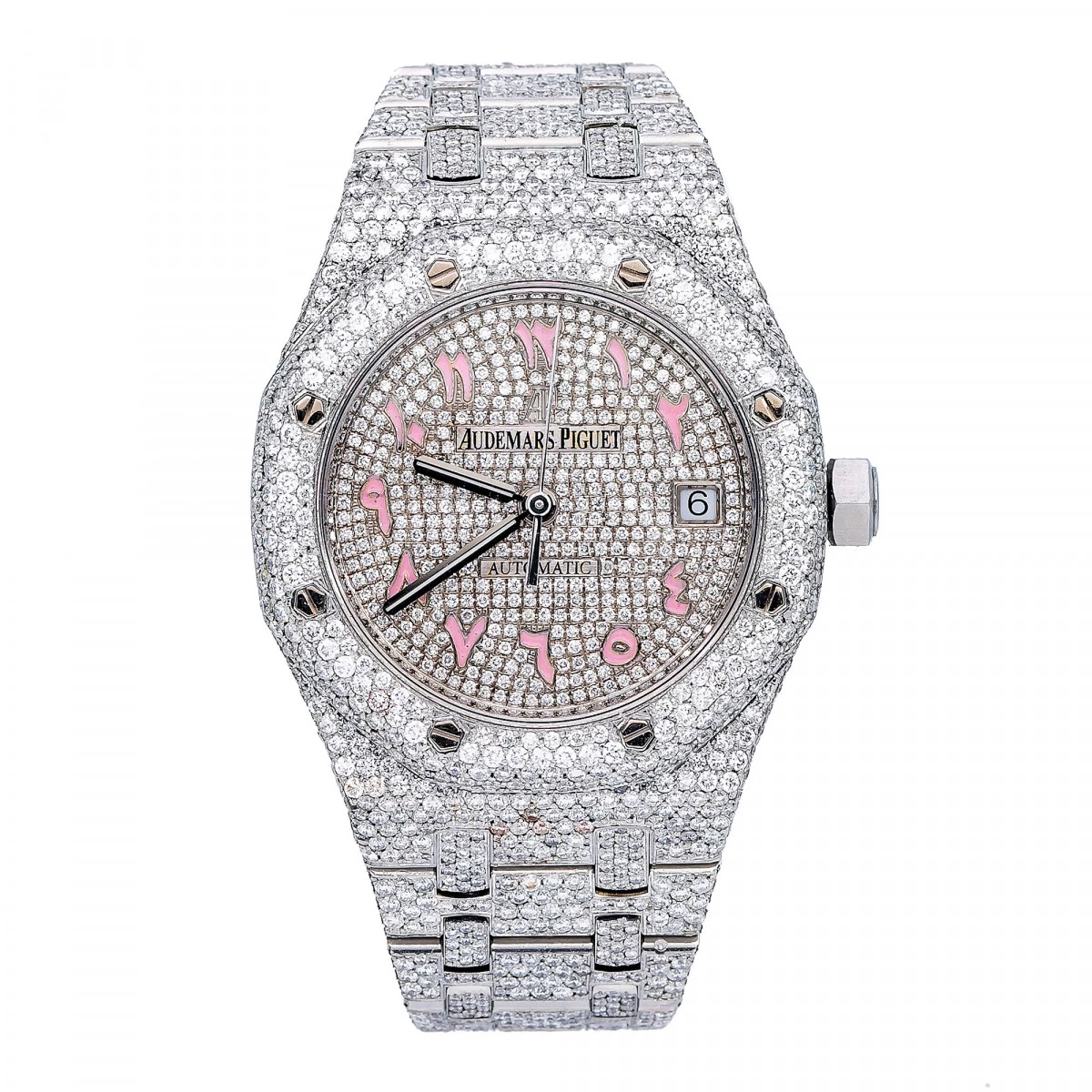 Introducing the Audemars Piguet Royal Oak Selfwinding Unisex Diamond Watch. This stunning timepiece is crafted from stainless steel and features a 37mm case diameter and a white dial with Arabic numerals. The bezel is set with 22.75 carats of white diamonds, while the bracelet is also set with diamonds for a luxurious look. The watch is powered by an automatic movement and is water resistant up to 50 meters. The sapphire crystal ensures that the watch is scratch-resistant and the engravable case back allows for a personal touch. This timeless watch is perfect for any occasion and is sure to be a treasured piece for years to come.