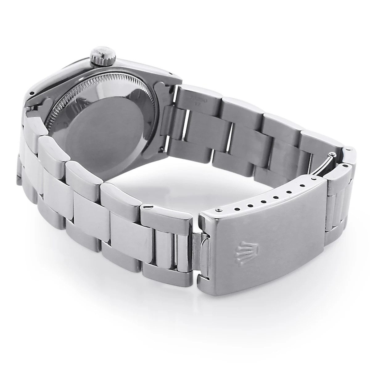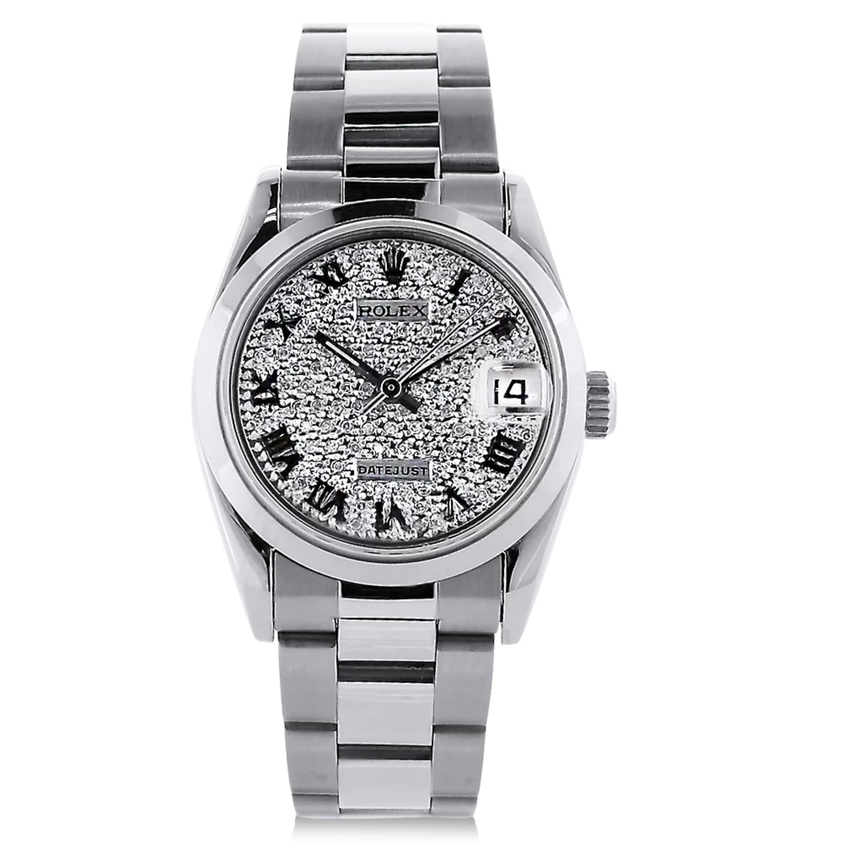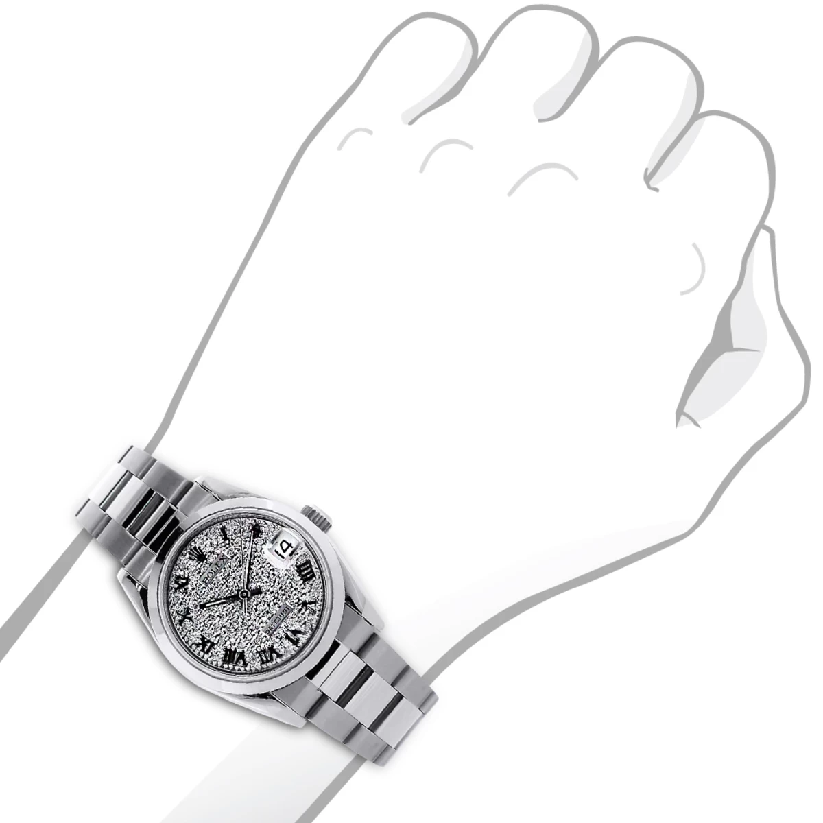 This Unisex Rolex Oyster Perpetual Datejust Custom Diamond Watch has a stainless steel case and a stainless steel oyster bracelet. Featuring a gorgeous iced-out dial with a custom after-market set of 1.5 carats of diamonds, a domed bezel, and a date display at a 3 o’clock position, this authentic Rolex watch showcases a scratch-resistant sapphire crystal and a deployment clasp for comfortable wear. This item is preowned in excellent condition and comes in an original box with a full 5-year warranty from ItsHot.com.