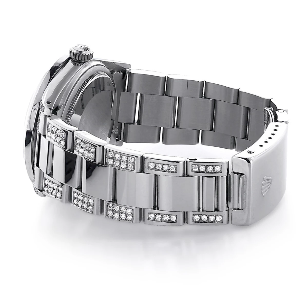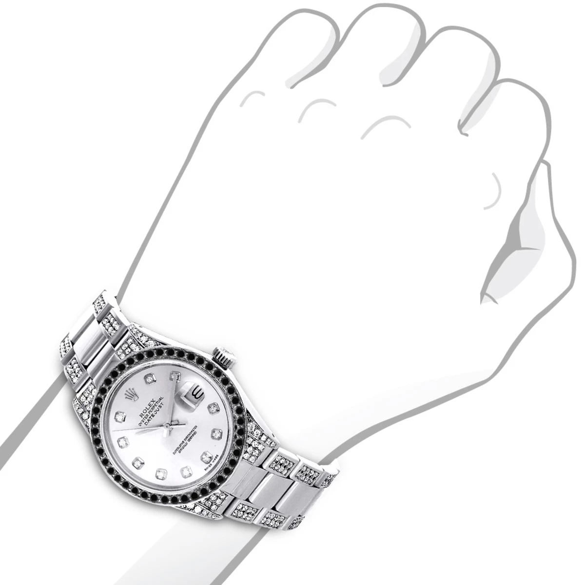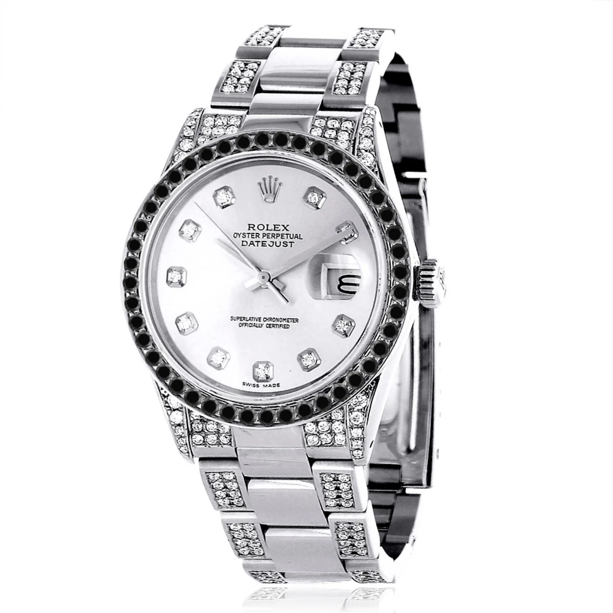 This custom diamond Rolex Datejust men’s watch features 7 carats of genuine custom set diamonds: 2 carats of black diamonds set in a bezel and 5 carats of white diamonds set in a stainless steel band. This Rolex Men’s Diamond Watch showcases a silver mother of pearl dial and a date display at the 3 o’clock position. Please note: this custom Rolex diamond watch is pre-owned in excellent condition and comes with a 5-year warranty from ItsHot.com.
