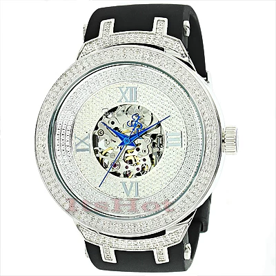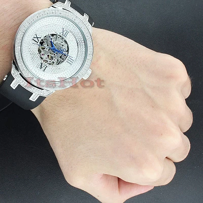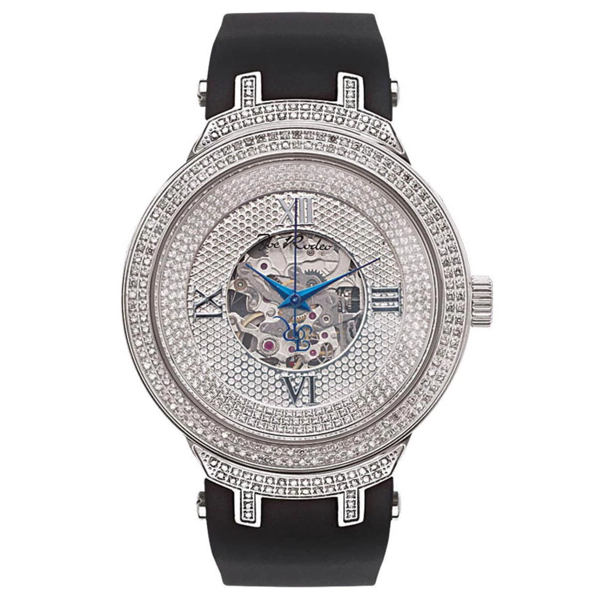 Luxurious Automatic Men’s Skeleton Watches! This Joe Rodeo Diamond Watch features automatic movement and 2.2 carats of genuine diamonds on the bezel and lugs; the watch dial is paved in white sparkling stones. This Joe Rodeo Master diamond watch comes with two interchangeable rubber bands in different colors. The patented strap adjusts once for a perfect fit, and comes on and off with the press of a button.