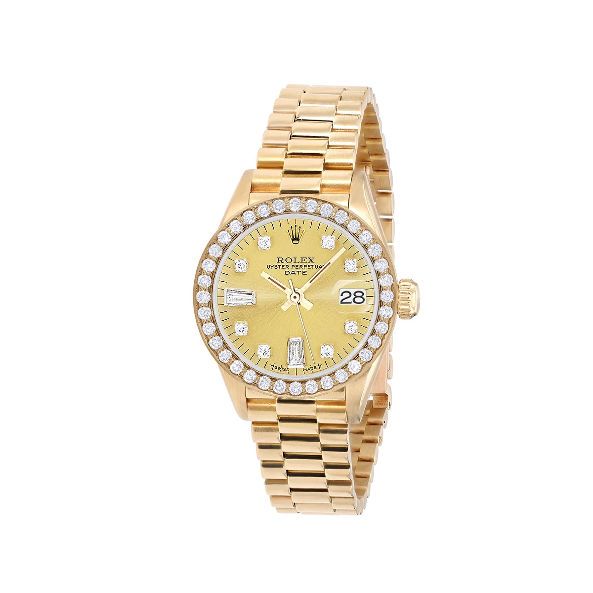 Women’s 18K Gold Watch Rolex Datejust 26mm Gold Tone Dial Diamond Bezel. This diamond Rolex watch is pre-owned, in excellent condition, and comes in a Rolex box with a full warranty from ItsHot.com. Customize the look of the watch if you prefer with diamond bezel or fluted bezel. Each watch can be additionally customized with diamonds on the case as well as band (please contact us for details).
