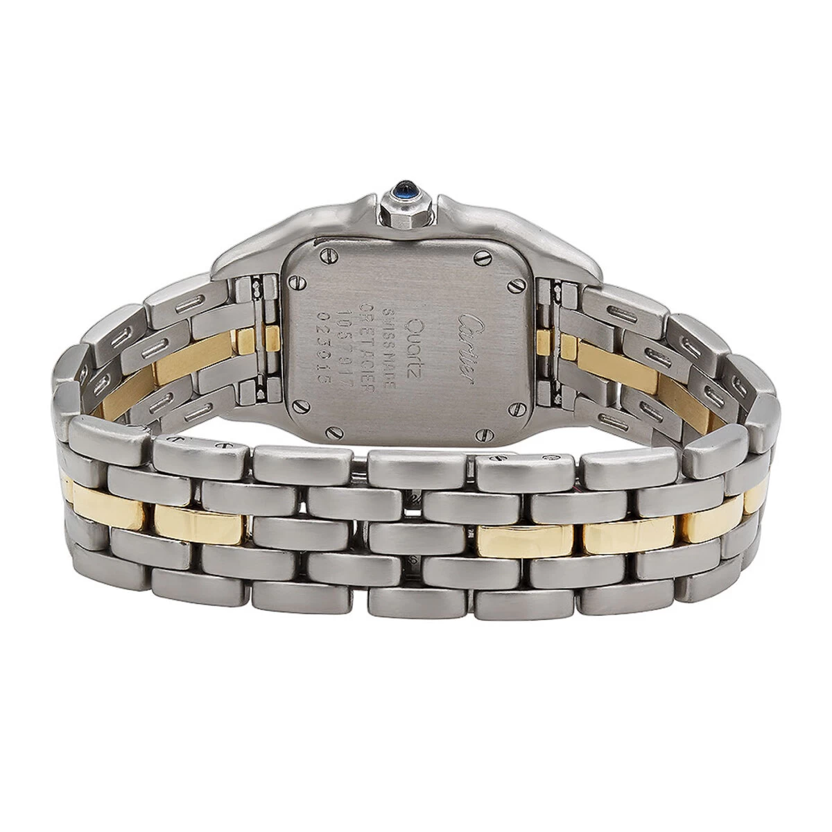 This fabulous Ladies Cartier Panthère de Cartier Mini 18K Gold & Steel Two-Tone Vintage Diamond Watch showcases a 22mm two-tone solid 18K gold and stainless steel case set with 1 carat of genuine round diamonds. This iconic ladies’ diamond watch is battery-operated with a Swiss quartz movement. Featuring a stainless steel and 18K solid yellow gold with custom set diamonds bezel, 18K gold and stainless steel band with a hidden folding deployment clasp, and an off-white dial. Please note: this custom Cartier diamond watch is pre-owned in excellent condition and comes with a 5-year warranty from ItsHot.com. Serial Cartie’s authentic number is engraved on the case.