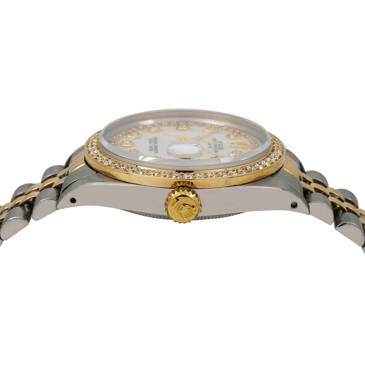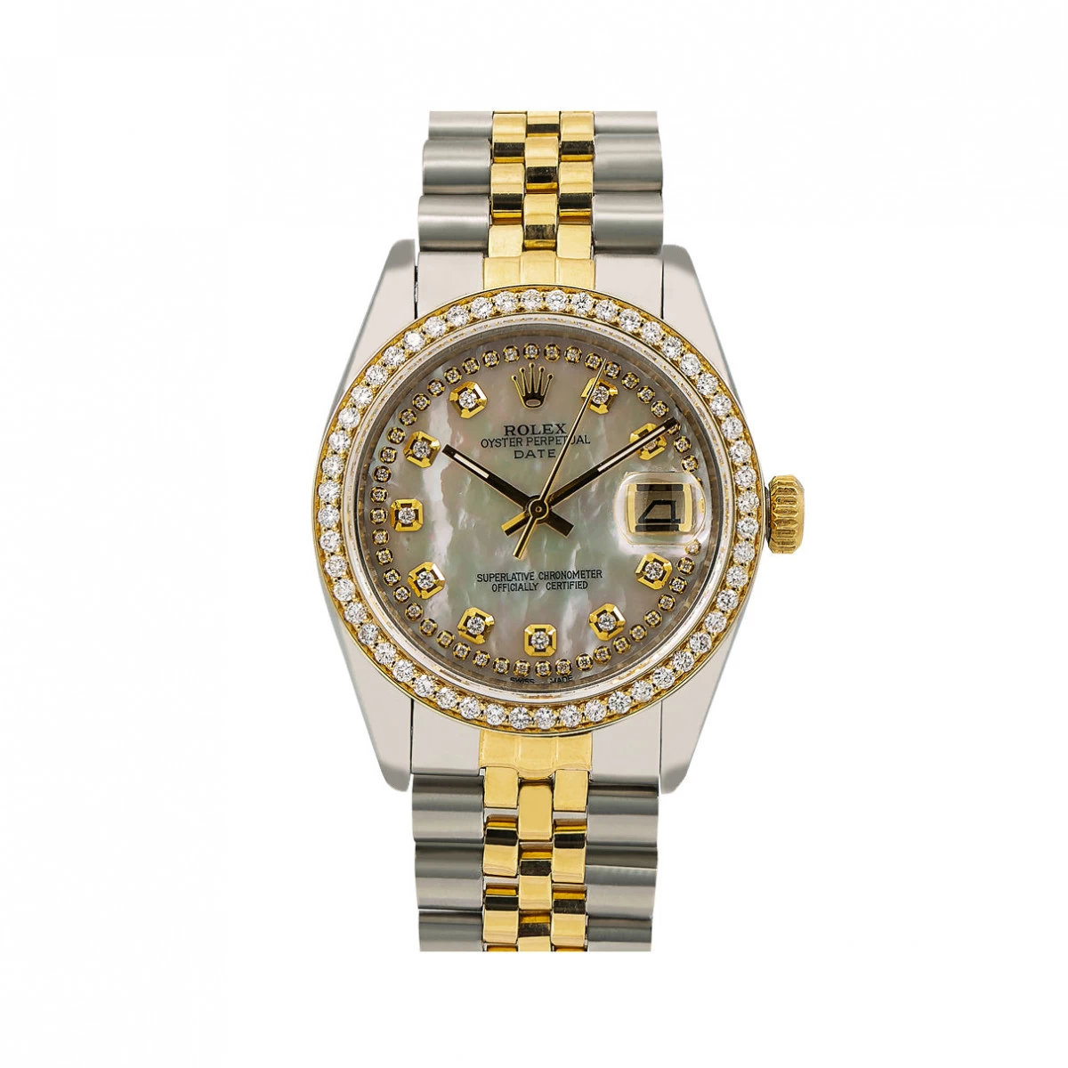 Introducing the Women’s Diamond Watch Rolex Oyster Perpetual Datejust 34mm in yellow gold and stainless steel. This stunning timepiece is crafted with a luxurious gold and stainless steel bracelet, and a 34mm case diameter. The bezel is adorned with diamonds and is set in a beautiful yellow-gold color. The dial is made of a mother-of-pearl. The watch is powered by automatic movement.This watch is perfect for any occasion, from a night out on the town to a formal event. The luxurious gold and stainless steel bracelet is comfortable to wear and adds a touch of elegance to any outfit. The diamonds on the bezel sparkle and shine, adding a touch of glamour to the watch. The mother-of-pearl dial is classic and timeless, and the Rolex logo adds a touch of sophistication.This watch is sure to become a treasured heirloom. It is backed by a 5-year warranty and is sure to last for generations. The Oyster Perpetual Datejust is a timeless classic that will never go out of style. It is the perfect gift for any woman who appreciates the finer things in life.