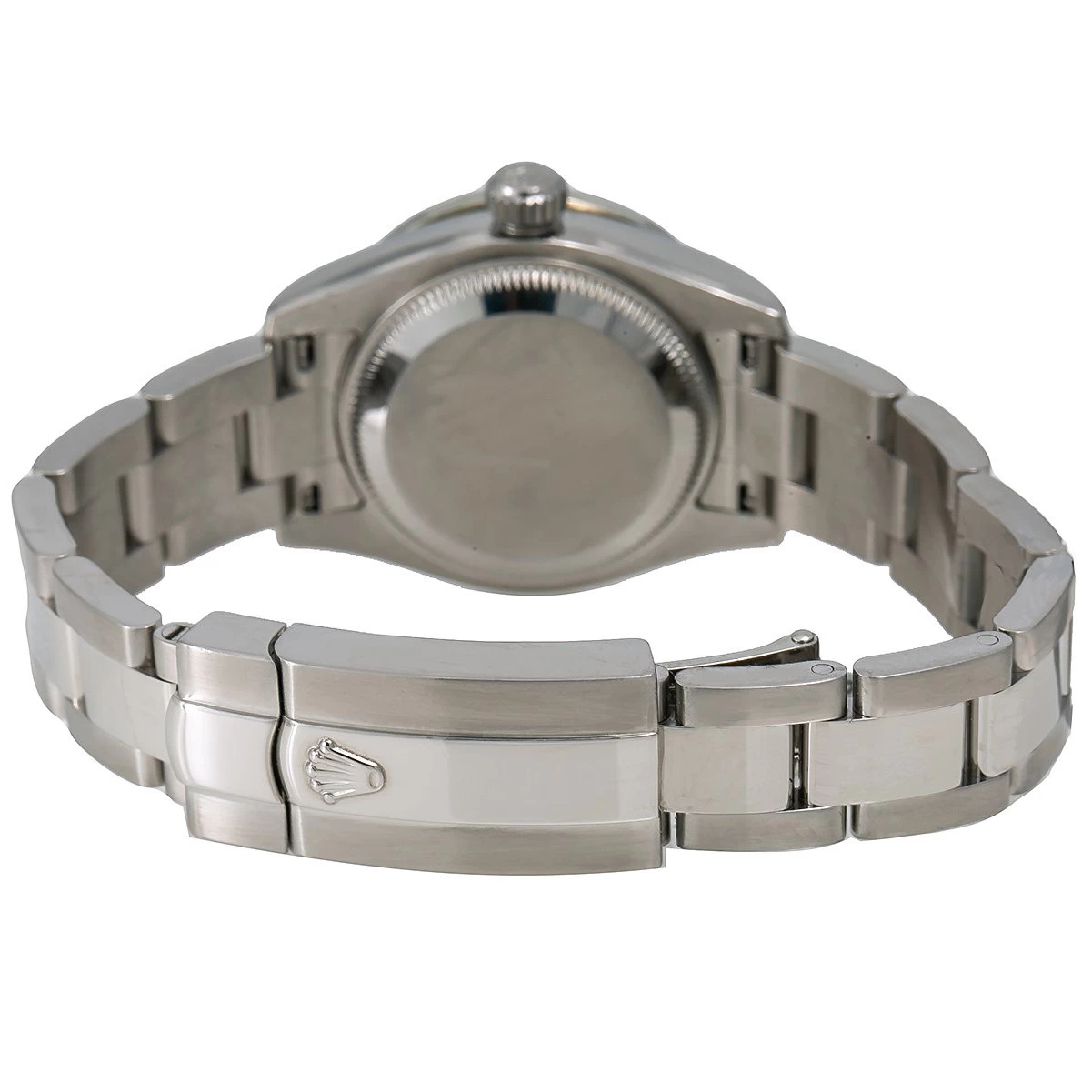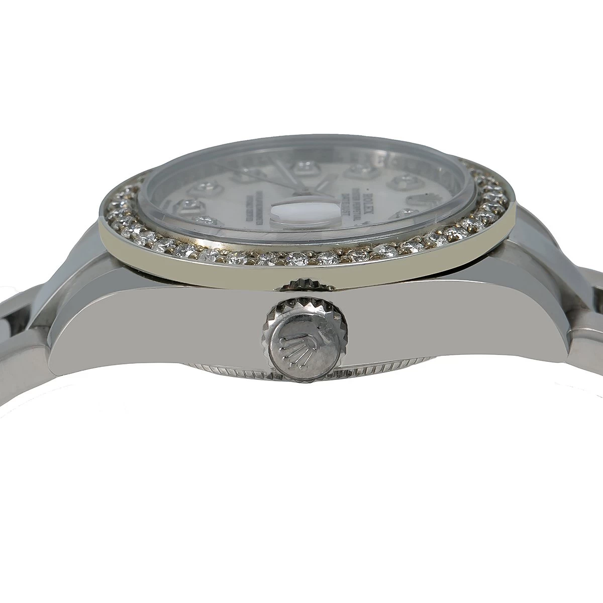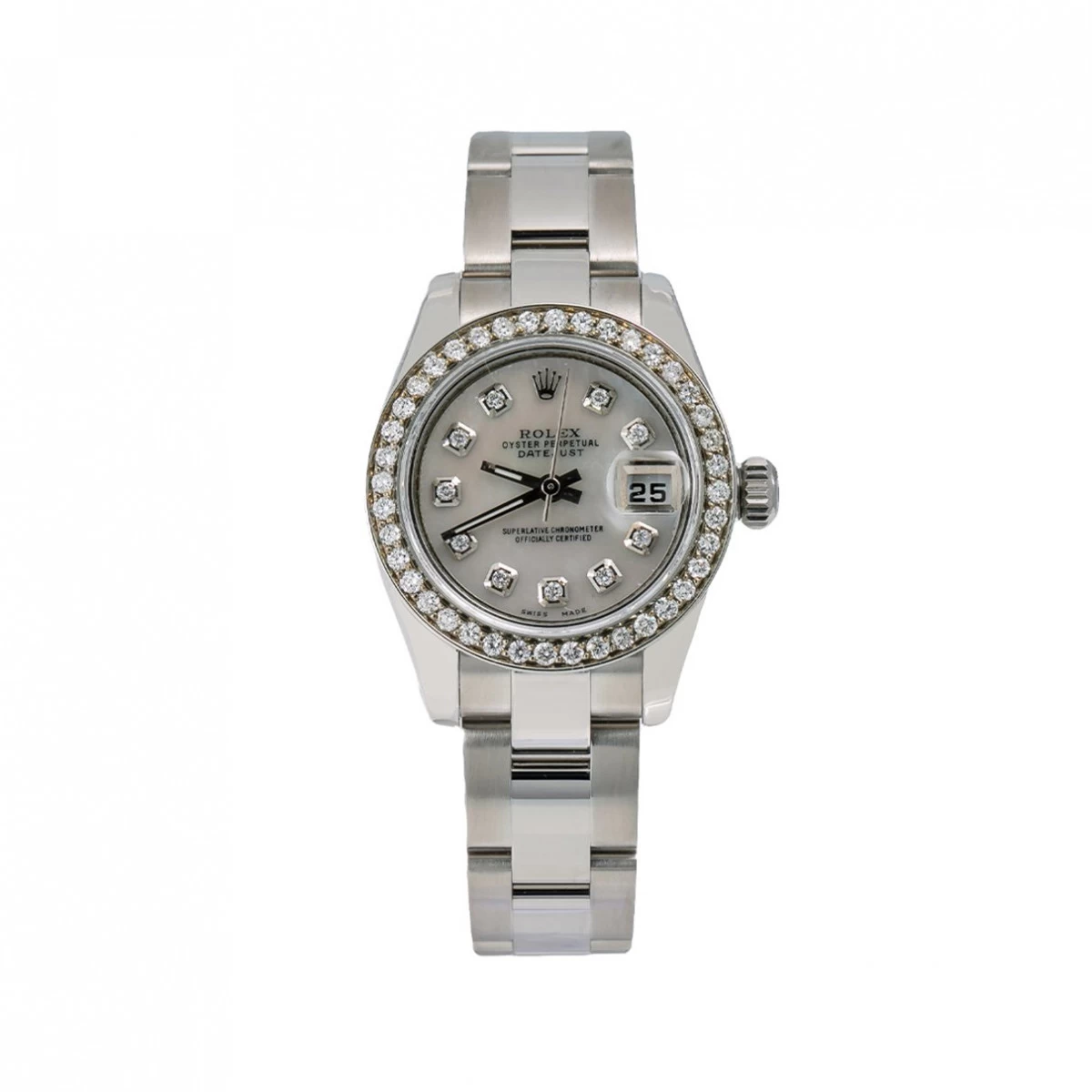 From our women’s diamond watches collection This ladies Rolex Datejust 179160 26mm Silver Diamond Dial With 0.9 carats of diamonds watch represents elegance and chic. This sophisticated timepiece is featuring a shiny stainless steel Oyster bracelet, a dazzling bezel decorated with white diamonds adding sparkle to the beautiful silver grey dial. The dial perfectly matches the watch color scheme and is featuring white round diamond hour markers and a date display at the 3 o’clock position. This ladies diamond Rolex watch features 0.9 carats of genuine diamonds, is conveniently water resistant and can become a wonderful, memorable, useful and symbolic present for a special occasion. Please note: this ladies Rolex watch is pre-owned, in excellent condition and comes in an original box with a full 5 year warranty from ItsHot.com.