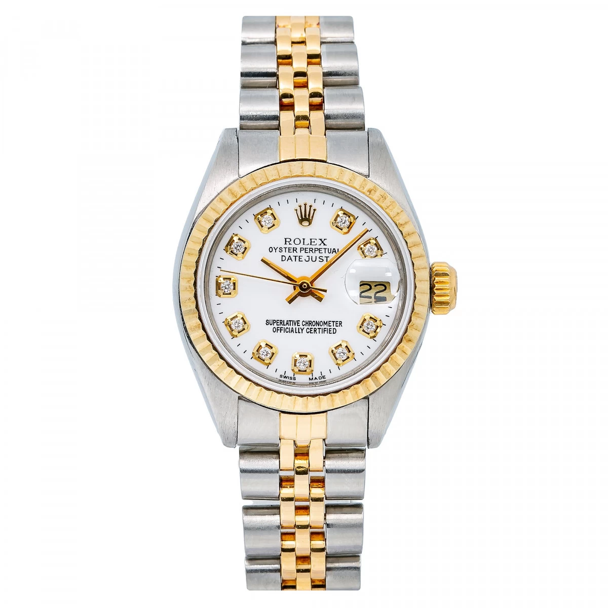 The Women’s Diamond Watch Rolex Datejust 26mm White Dial is a timeless classic that will never go out of style. This luxurious timepiece features a 26mm yellow gold case and a white dial with diamond markers. The bezel is crafted from yellow gold and the bracelet is a combination of yellow gold and stainless steel. The watch is powered by an automatic movement.This watch is perfect for any occasion, whether you’re attending a formal event or just want to add a touch of elegance to your everyday look. The diamonds on the dial add a touch of sparkle and the yellow gold and stainless steel bracelet make it a timeless piece. The watch is also engravable, so you can add a personal touch to make it even more special.The Women’s Diamond Watch Rolex Datejust 26mm White Dial is a luxurious timepiece that will last for years to come. It comes with a five-year seller’s warranty, so you can be sure that it will be a reliable and stylish addition to your wardrobe. With its classic design and timeless elegance, this watch is sure to become a favorite in your collection.