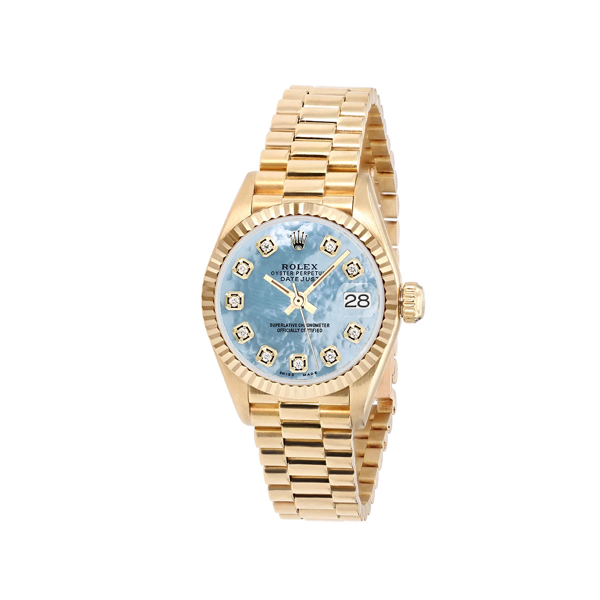 Introducing the Rolex Datejust 18K Yellow Gold 26mm Blue Dial W00146 Women’s Diamond Watch. This exquisite timepiece is crafted from 18K yellow gold and features a 26mm case, a blue dial adorned with diamonds, and a President bracelet. The watch is powered by an automatic movement.The Rolex Datejust is a classic and timeless design that has been in production since 1945. The watch features a bezel made from 18K yellow gold, a sapphire crystal, and a date window at the 3 o’clock position. The watch is also engravable, making it a perfect gift for a special occasion.The Rolex Datejust is a luxurious and elegant watch that is sure to make a statement. The watch is perfect for any occasion, whether it be a formal event or a night out on the town. The watch is sure to be a conversation starter and will be sure to turn heads.The Rolex Datejust is a timeless piece of craftsmanship that is sure to last for years to come. The watch comes with a 5 year seller’s warranty and is sure to be a treasured piece for years to come. The watch is perfect for any woman who appreciates luxury and elegance.