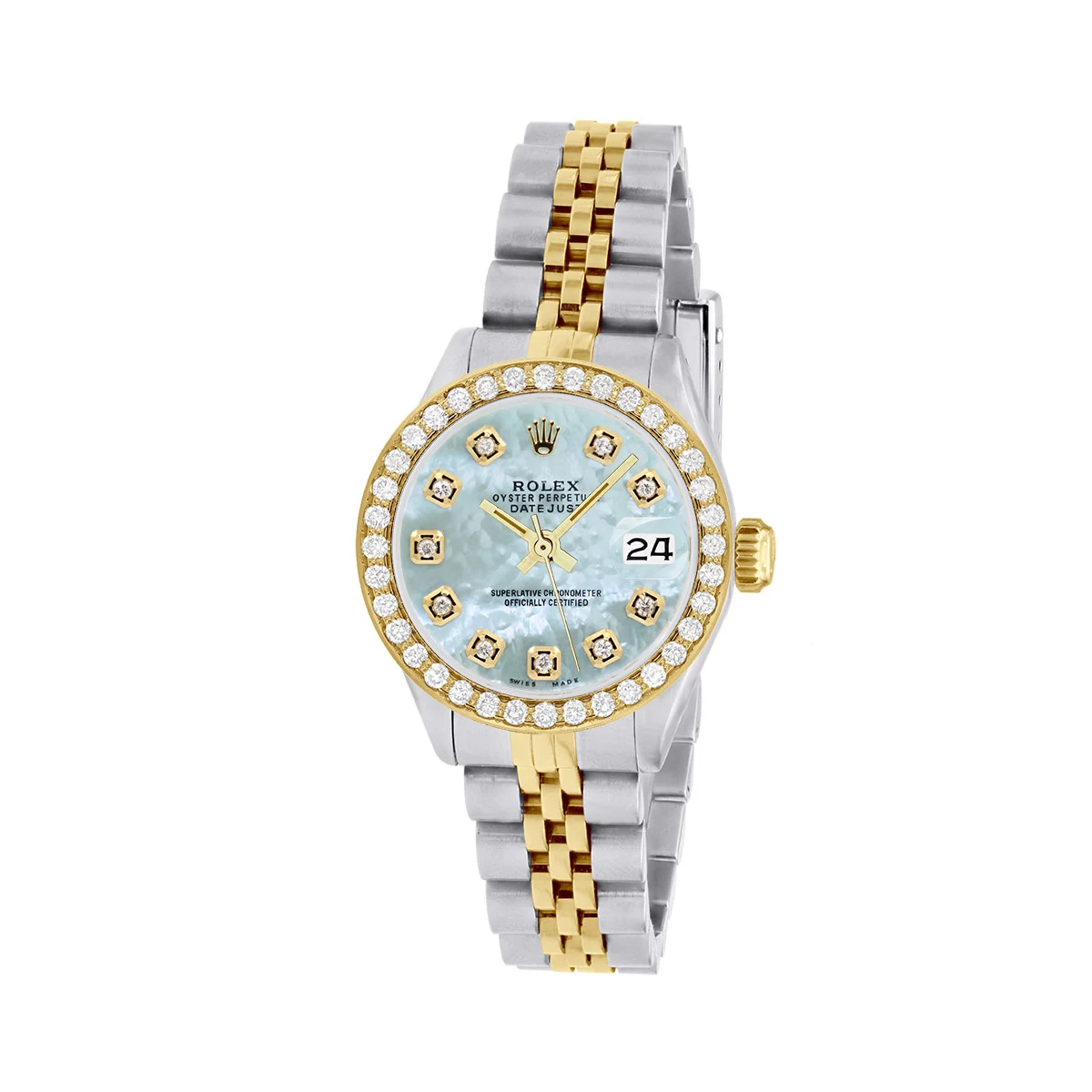 Women’s Diamond Watch Rolex Datejust 26mm Blue Mother Of Pearl Dial. This diamond Rolex watch is pre-owned, in excellent condition, and comes in a Rolex box with a full warranty from ItsHot.com. Customize the look of the watch if you prefer with diamond bezel or fluted bezel. Each watch can be additionally customized with diamonds on the case as well as band (please contact us for details).
