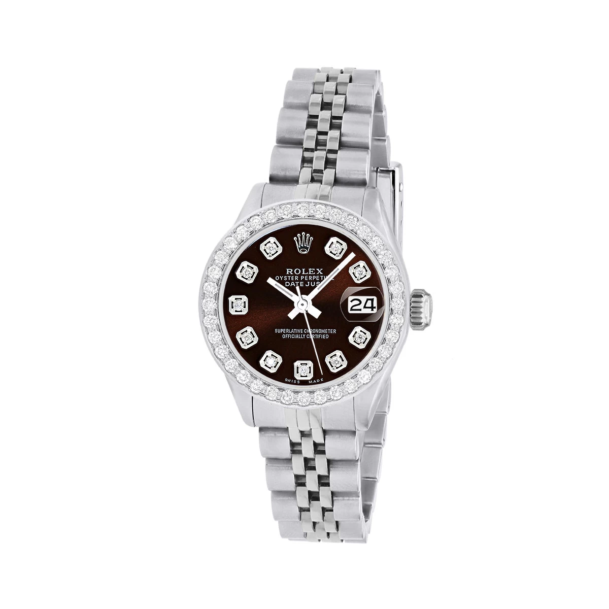 Women’s Diamond Watch Rolex Datejust 26mm Dark Red Dial. This diamond Rolex watch is pre-owned, in excellent condition, and comes in a Rolex box with a full warranty from ItsHot.com. Customize the look of the watch if you prefer with diamond bezel or fluted bezel. Each watch can be additionally customized with diamonds on the case as well as band (please contact us for details).