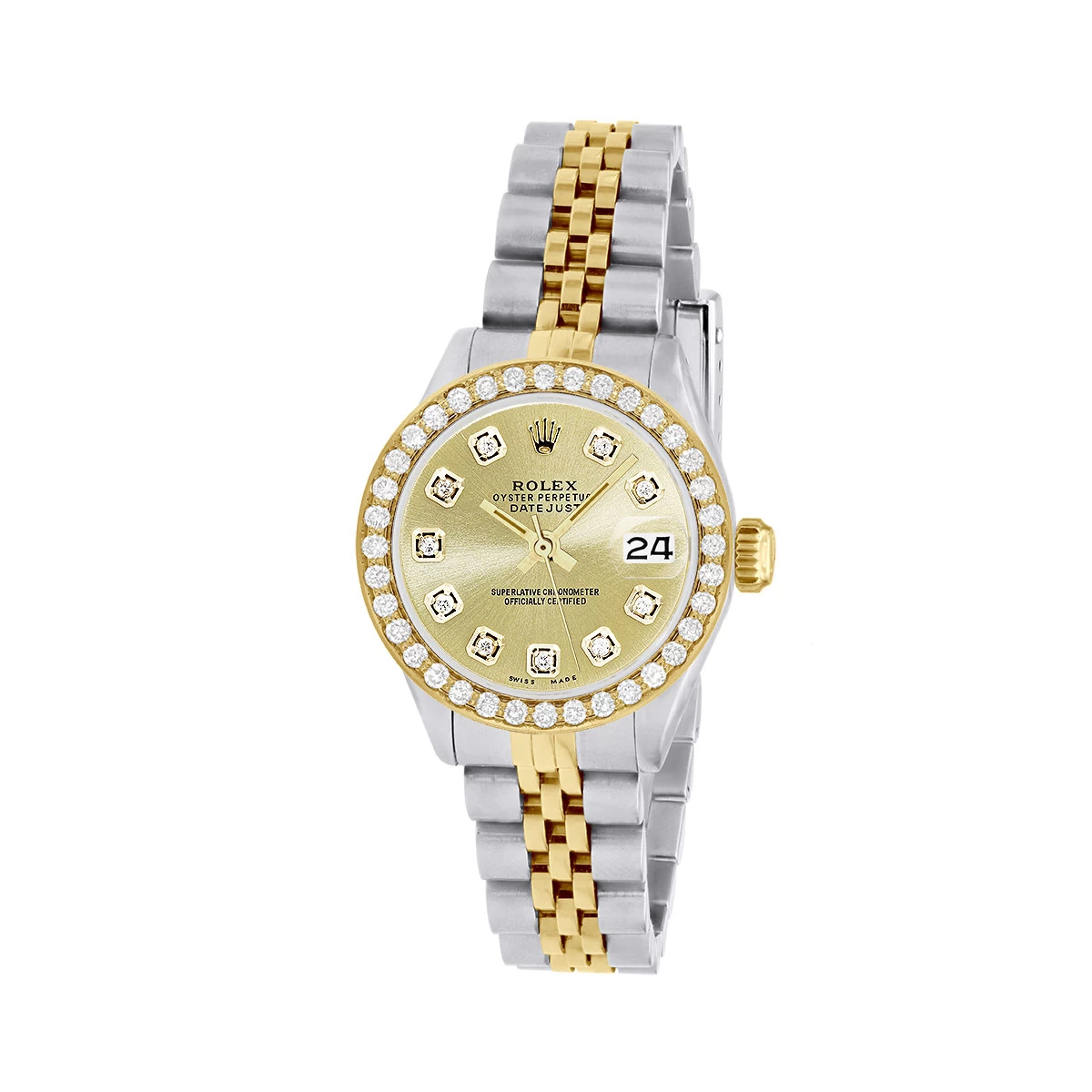 The Rolex Oyster Perpetual Datejust is the perfect watch for the modern woman. This beautiful timepiece is crafted from a combination of yellow gold and stainless steel, with a 26mm case diameter and a champagne dial. The bezel is set with diamonds and is made from yellow gold, while the bracelet is made from yellow gold and stainless steel. The dial is adorned with diamonds, and the crystal is a sapphire crystal. The movement is automatic, and the watch is engravable.This watch is perfect for any occasion, whether you’re attending a formal event or just running errands. The yellow gold and stainless steel combination gives the watch a classic look that will never go out of style. The diamonds on the bezel and dial add a touch of sparkle and glamour, making this watch a timeless piece. The sapphire crystal ensures that the watch is scratch-resistant and will last for years to come.The Rolex Oyster Perpetual Datejust is a luxurious timepiece that will make a statement wherever you go. It is a classic and timeless piece that will never go out of style. This watch comes with a 5-year seller’s warranty, so you can be sure that your investment is protected.