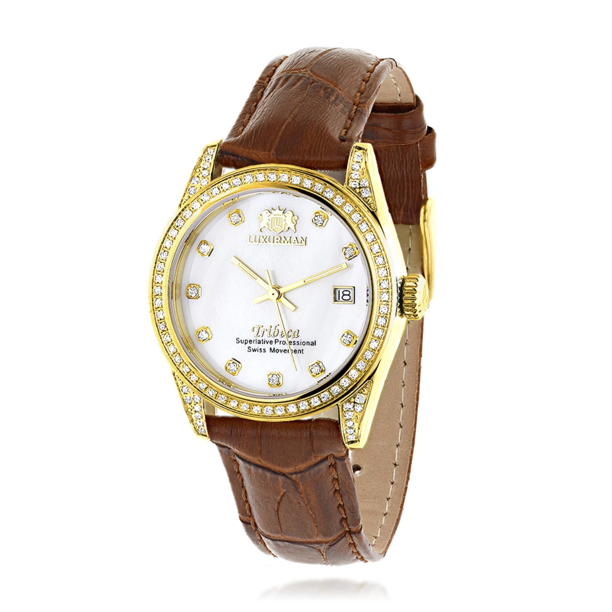 This Women’s Diamond Watch by Luxurman Tribeca is plated in 18K Yellow Gold and features 1.5 carats of genuine diamonds, a Swiss movement, luxurious mother of pearl dial, a date display window at a 3 o’clock position and brown genuine leather band. This stylish ladies diamond Luxurman watch comes with two extra leather interchangeable straps in different colors (white and black) and 5 year warranty. This Luxurman Diamond watch makes a perfect present for any occasion.
