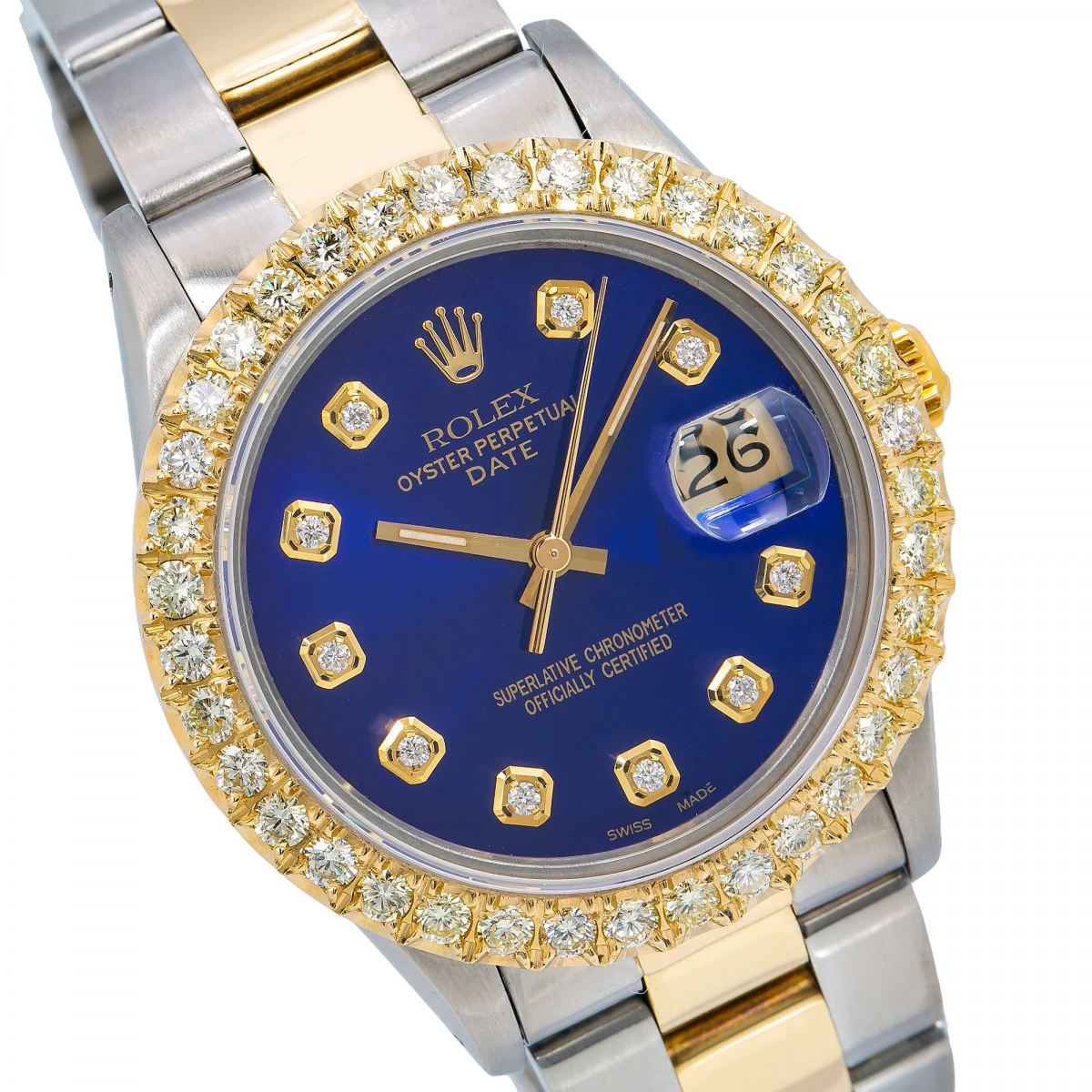 Introducing the women’s Rolex Oyster Perpetual Datejust 34mm. This exquisite timepiece is crafted with a luxurious combination of gold and stainless steel, and features a stunning blue dial with diamond accents. The bezel is made of gold and set with sparkling white diamonds, while the bracelet is crafted from gold and stainless steel with a yellow finish. This gold and diamond Rolex Datejust 34mm is powered by automatic movement.This Rolex watch for women with a blue dial is a timeless classic that will never go out of style. The 34mm case diameter and sapphire crystal make this watch a perfect choice for any occasion. The engravable case back allows you to add a personal touch to your timepiece. This watch is backed by a 5-year warranty, so you can be sure that your investment is well protected.The gold diamond Rolex watch is a stunning timepiece that will add a touch of elegance to any ensemble. With its luxurious gold and stainless steel construction, diamond accents, and blue dial, this watch is sure to be a conversation starter. Whether you are looking for a special gift or a timeless accessory for yourself, this watch is sure to make a lasting impression.