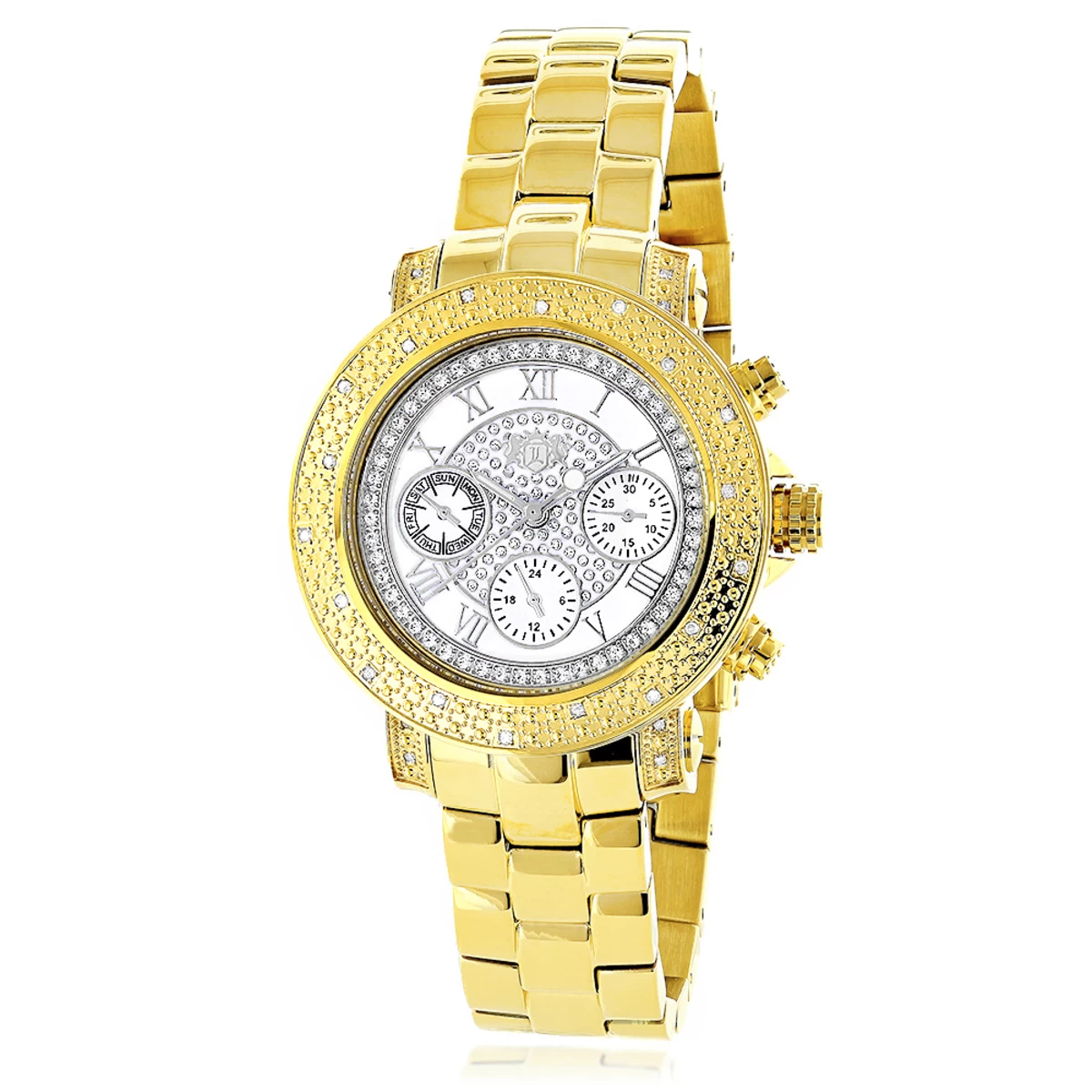 This Yellow Gold Plated Luxurman Diamond Watch For Women White MOP Montana showcases 0.3 carats of genuine diamonds and features a polished yellow gold plated stainless steel case with a yellow gold plated stainless steel band and a white mother of pearl dial with three subdials. This luxurious ladies diamond watch by Luxurman conveniently water-resistant to 30 m (110 ft), and has top industry warranty of 2 years.