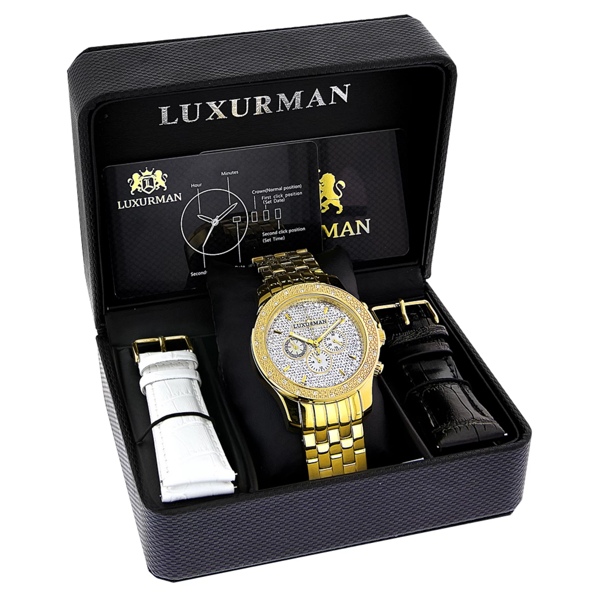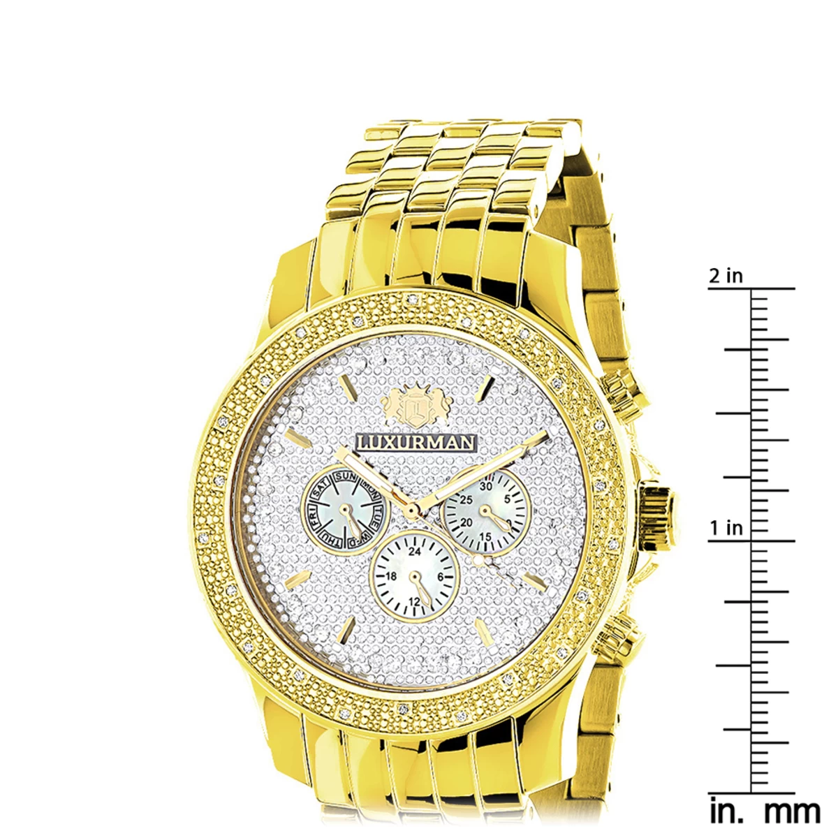 Luxurious Yellow Gold Tone Watches: This Luxurman Men’s Diamond Watch features 0.25 carats of genuine diamonds, a polished yellow gold tone stainless steel case, a stainless steel band and a face paved in white sparkling stones with three subdials. This Luxurman diamond watch showcases a fine Japan-made quartz movement and is water-resistant.