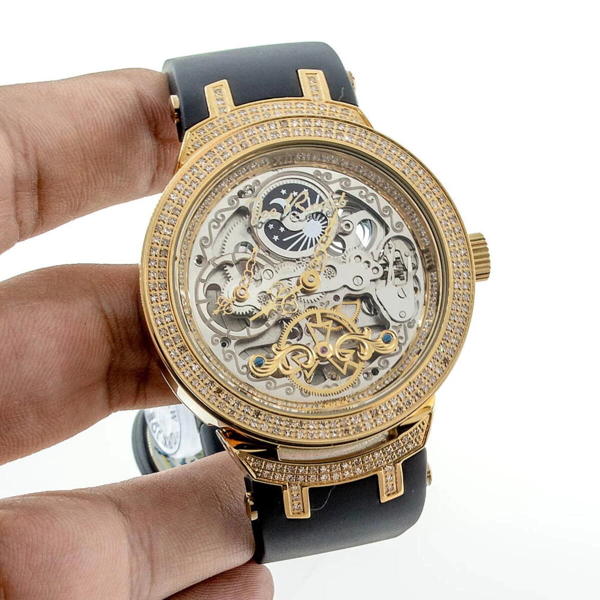 Diamond Watches for Men Collection: This Designer Yellow Skeleton Watch by Joe Rodeo Master Diamond Watches features 2.2 carats of genuine diamonds, a yellow gold tone stainless steel case and a black rubber band. This men’s diamond watch showcases a unique skeleton dial and skeleton back of the case and day/night function. This Joe Rodeo Master diamond watch is equipped with a very accurate Swiss-made quartz chronograph movement and comes with extra interchangeable watch bands in different colors.